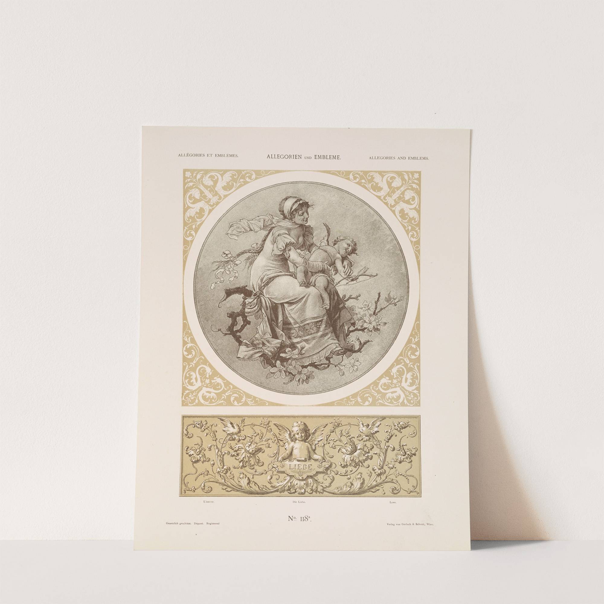 This art print features two intricately detailed etchings in monochromatic sepia tones, each encased within elegant border designs. The upper illustration depicts a tender scene of a mother gently holding her infant, surrounded by delicate floral patterns. She wears a...