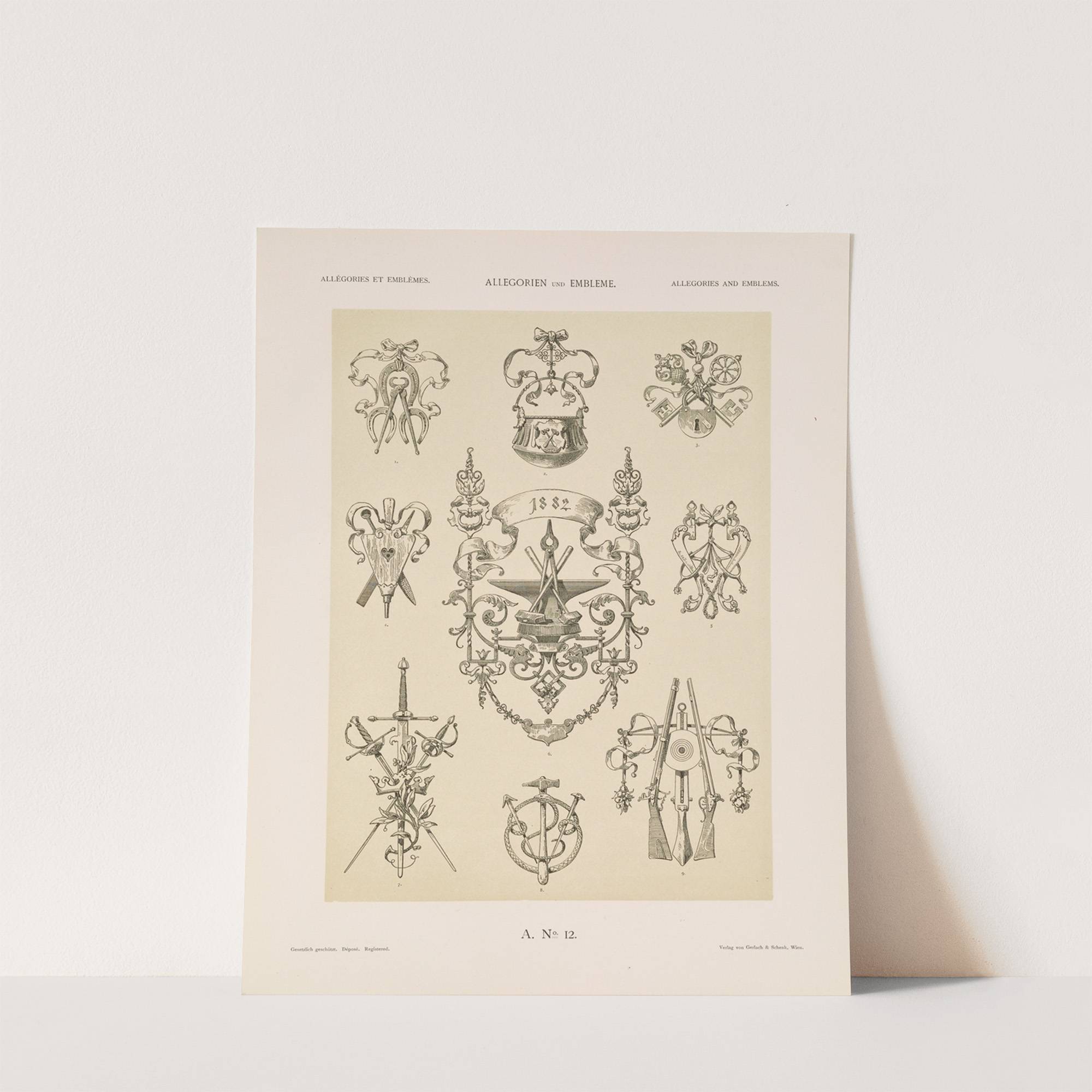 This elegant art print is a reproduction of "Allegorie und Embleme Vol. II Pl.013" by the renowned artist Albert Ilg. The illustration features a beautifully detailed collection of emblems and allegories, rendered in a classic black-and-white pen-and-ink style on a...
