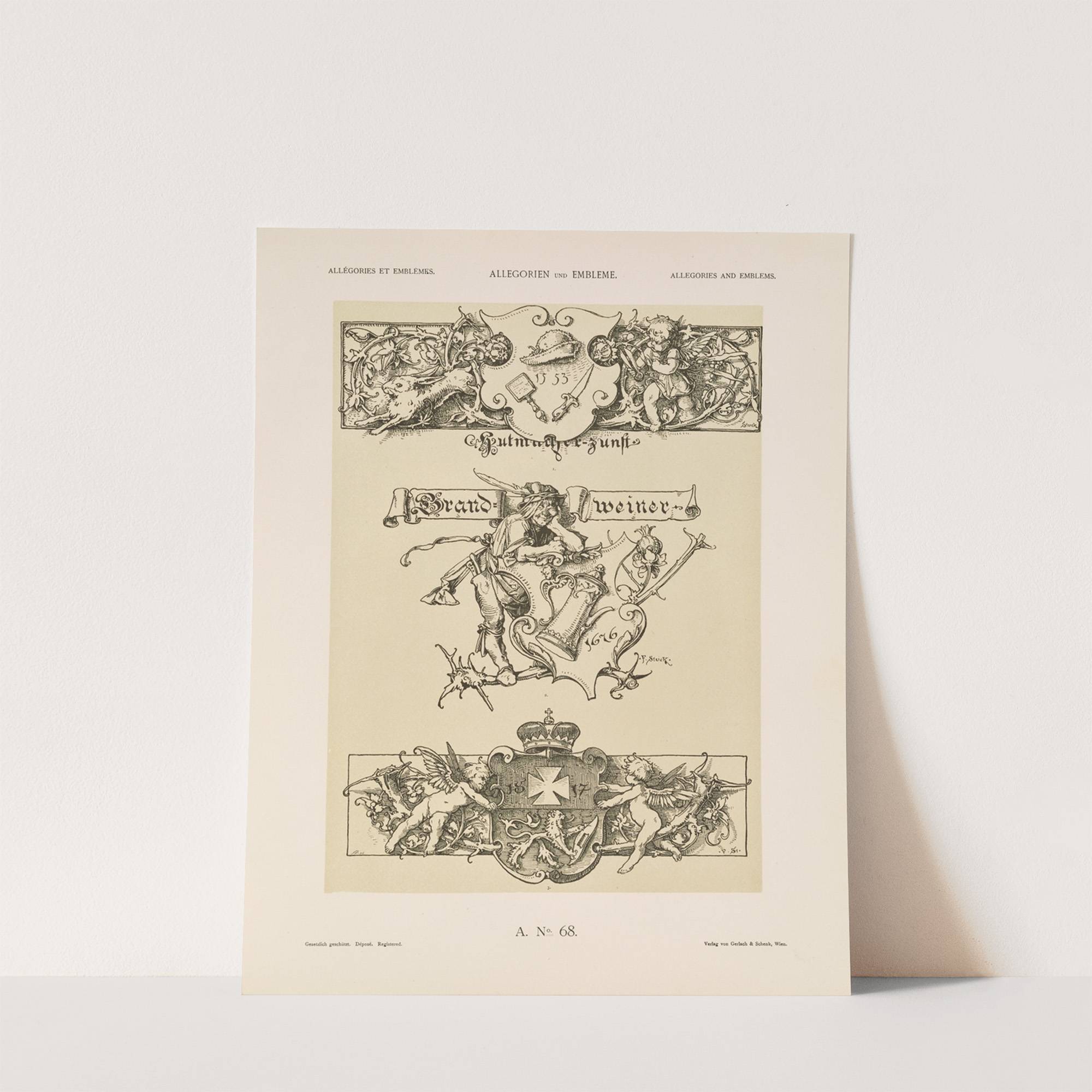 This print features intricate black-and-white illustrations from "Allegorie und Emblème" Volume II, Plate 78, created by artist Albert Ilg. The three sections of the print are separated by thin borders and titled in elegant script.The top section showcases a complex...