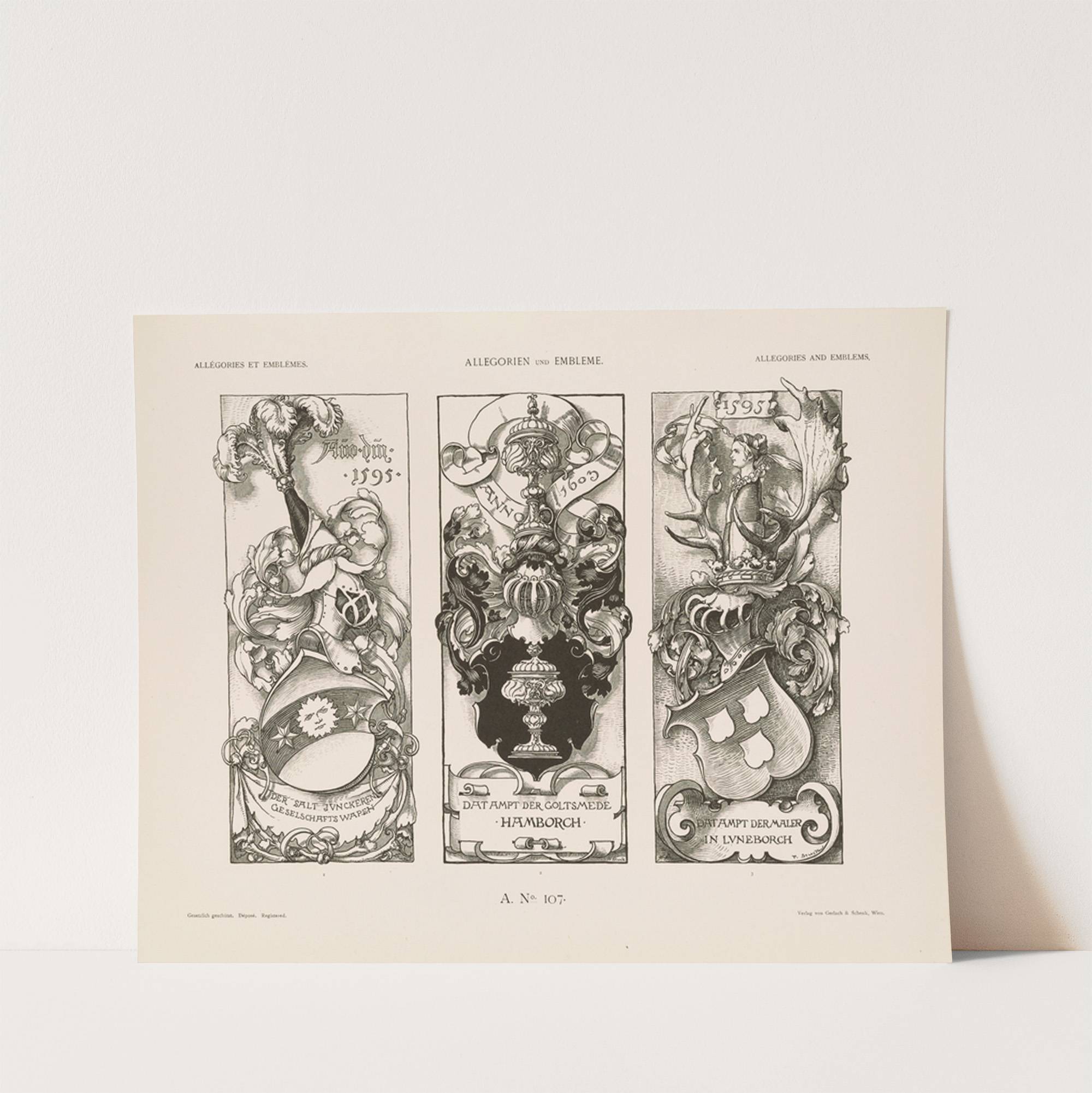 This art print features a series of three intricate black and white illustrations from "Allegorie und Embleme" Volume II, Plate 117 by artist Albert Ilg. Each panel presents elaborate, ornate designs with rich detailing.The left panel depicts an allegorical figure...