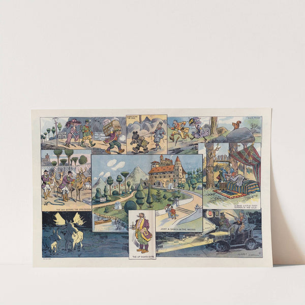 Experience "Back to Nature" by Albert Levering, a captivating blend of medieval charm and vibrant storytelling in a comic strip style print. This artwork is rich with detail, featuring multiple panels that weave together to depict a lively historical scene....