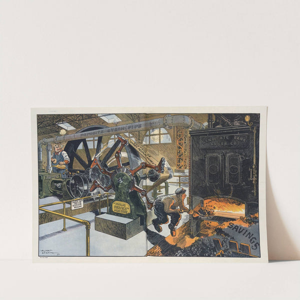 This vibrant print captures the intense atmosphere of a historic steam locomotive factory floor in striking detail. "The Stoker" by artist Albert Levering features a dynamic scene centered around a powerful steam engine and a hardworking stoker. The stoker, clad...