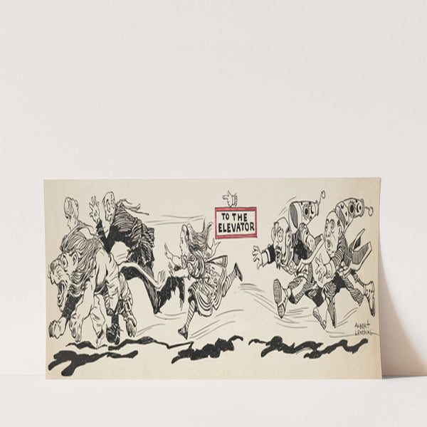 This striking print features "To the Elevator" by Albert Levering, an example of bold, black-and-white illustration with strong graphic lines and dynamic movement. The central focus is on a group of cartoon-like characters in mid-motion, each depicted with exaggerated, expressive...