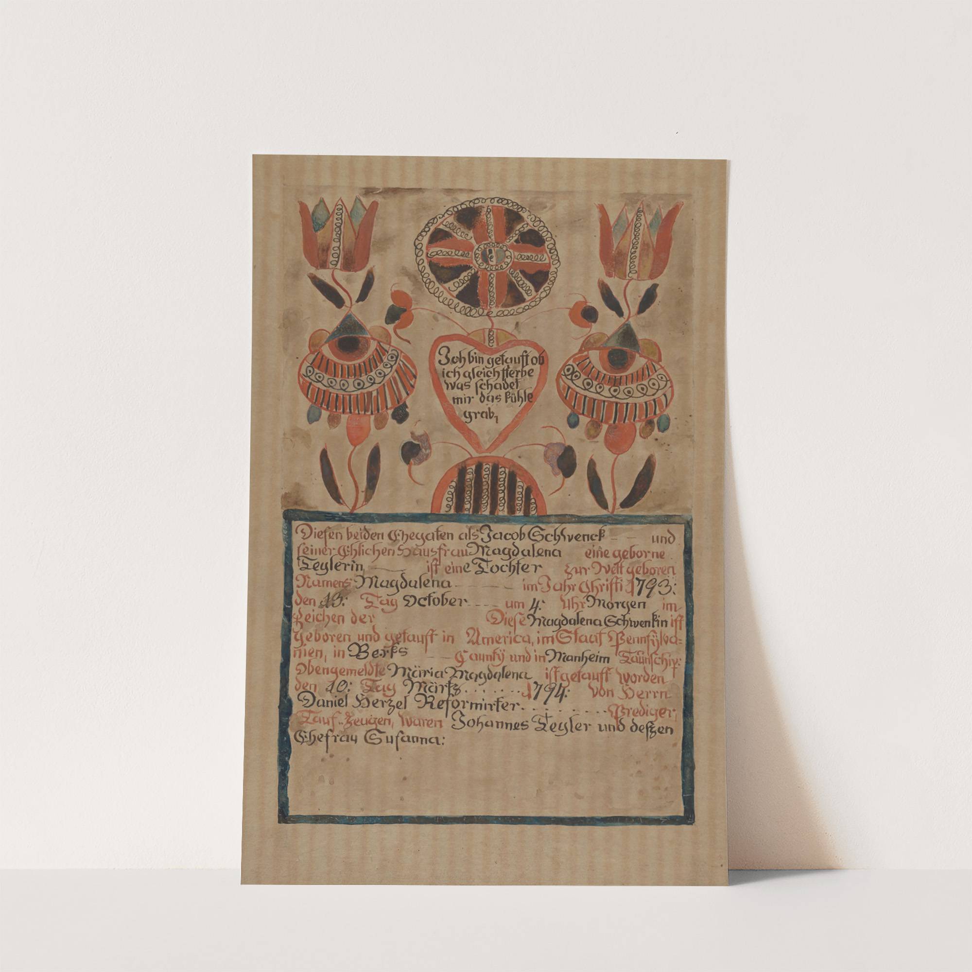 This intricate medieval manuscript features the artwork "Pa. German Birth Certificate" by Albert Levone. The piece is set against an aged, beige parchment background that adds to its historical charm. At the top, there's a vibrant red and black circular...