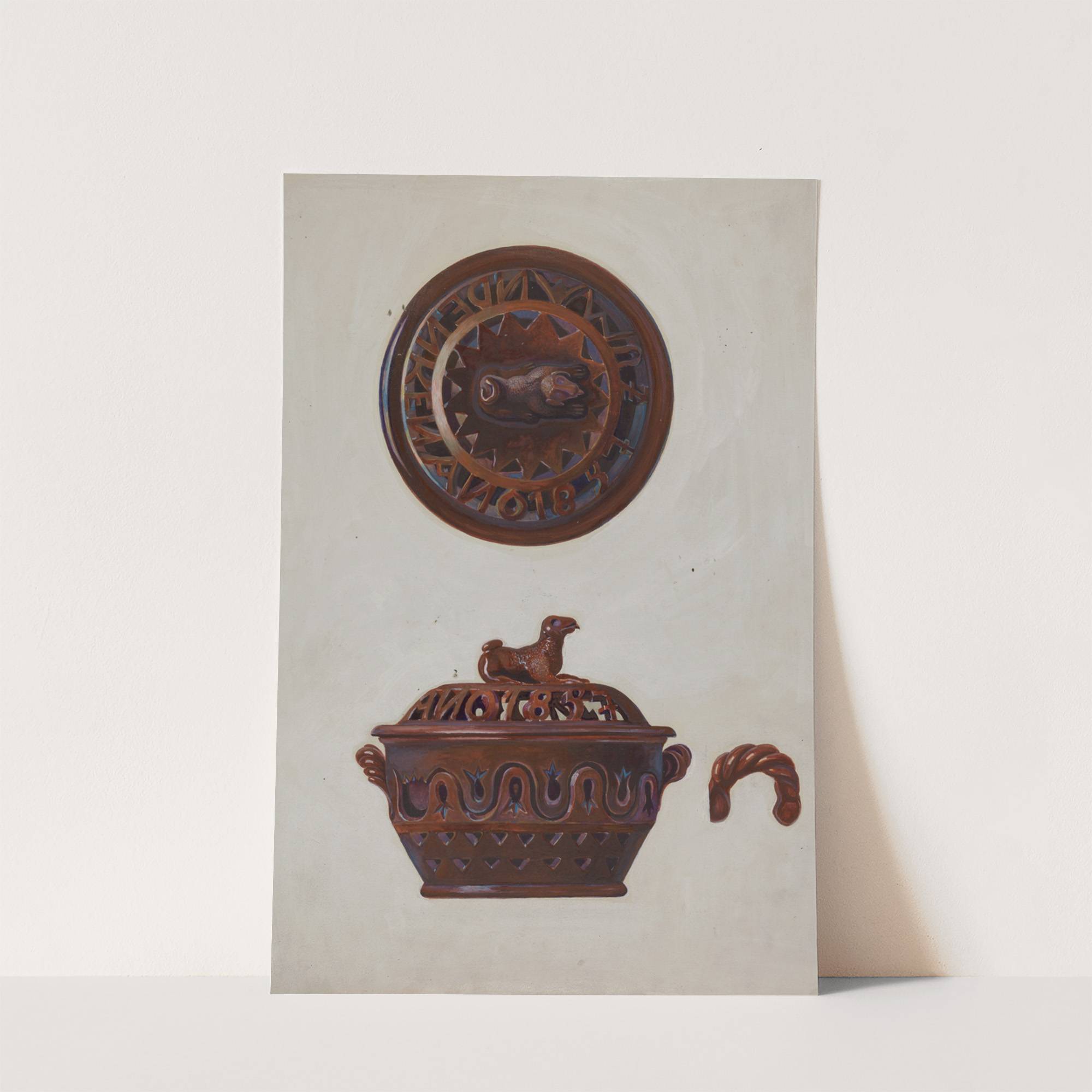 This stunning print features "Pa. German Tobacco Bowl with Lid" by artist Albert Lehné, showcasing intricate craftsmanship in rich, dark brown hues. The artwork highlights two main elements: the ornate wooden tobacco bowl below and an accompanying decorative lid above....