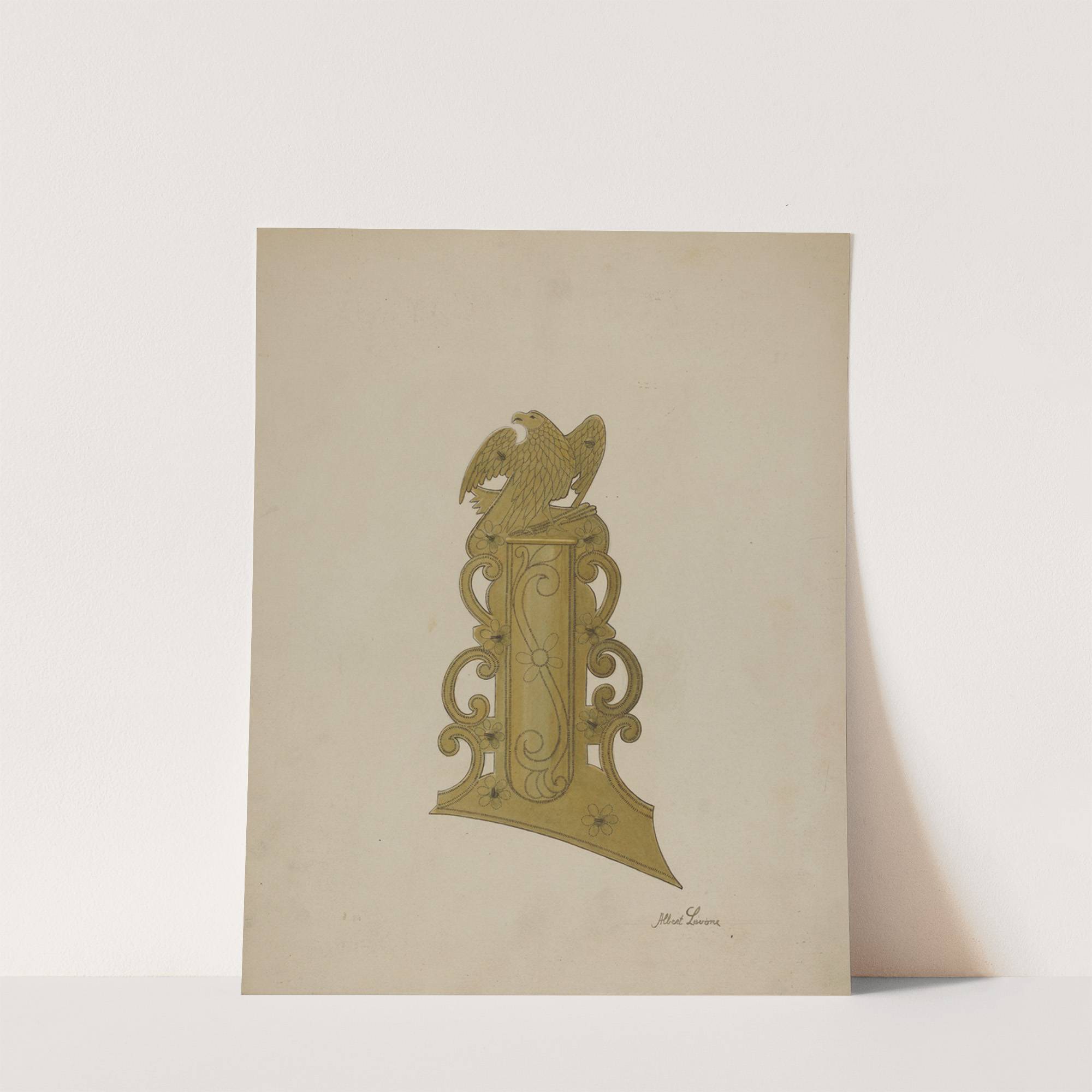 This exquisite art print features "Patch Box of Kentucky Rifle" by renowned artist Albert Levone. The design showcases a beautifully detailed golden eagle perched atop an ornate pedestal with intricate scrollwork and floral motifs. The eagle, poised majestically at the...