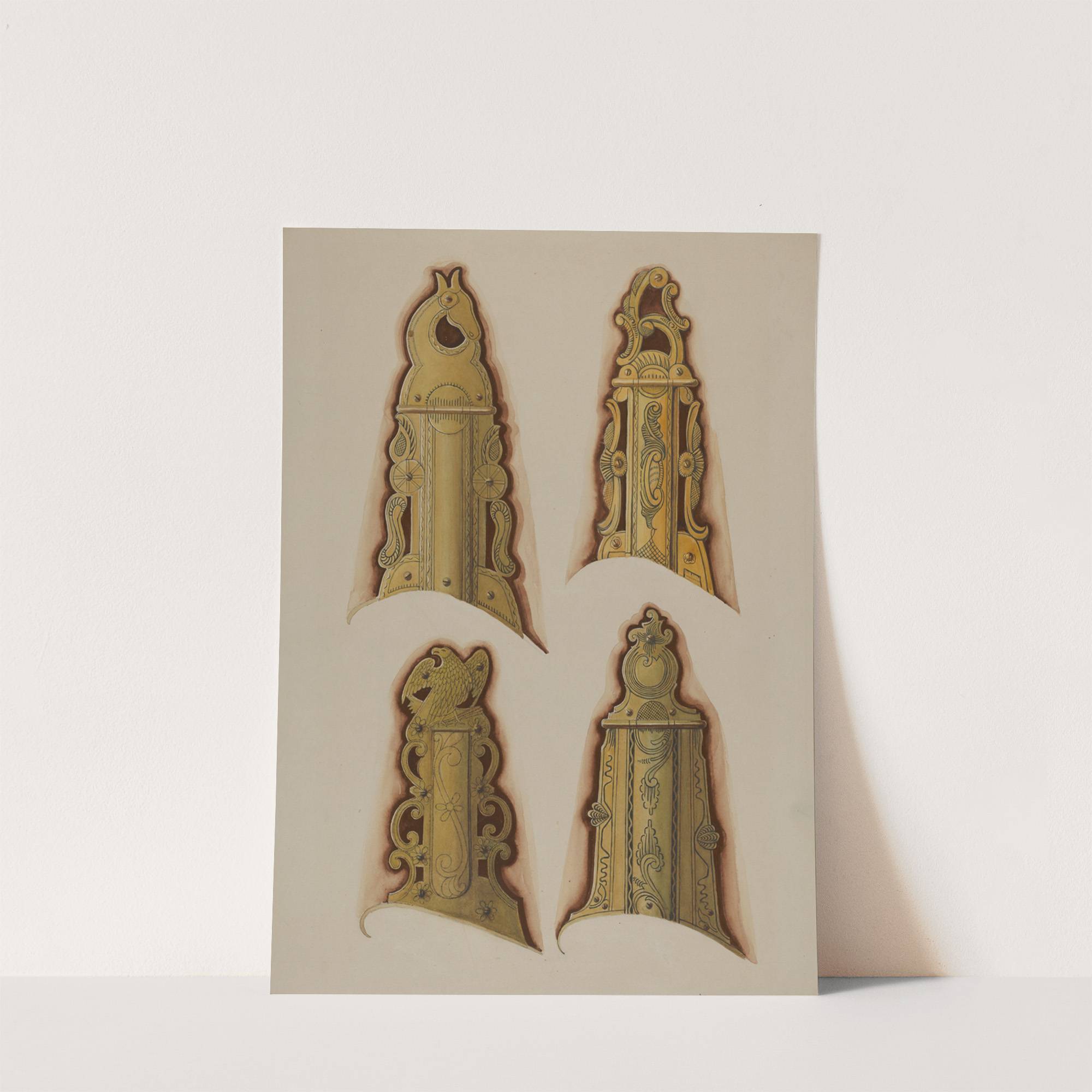 Presenting "Patch Boxes of Kentucky Rifles" by artist Albert Levone, this exquisite artwork captures three intricately detailed brass patch boxes in a minimalist presentation on an off-white background. Each box features elaborate, ornate designs with unique carvings and patterns. The...