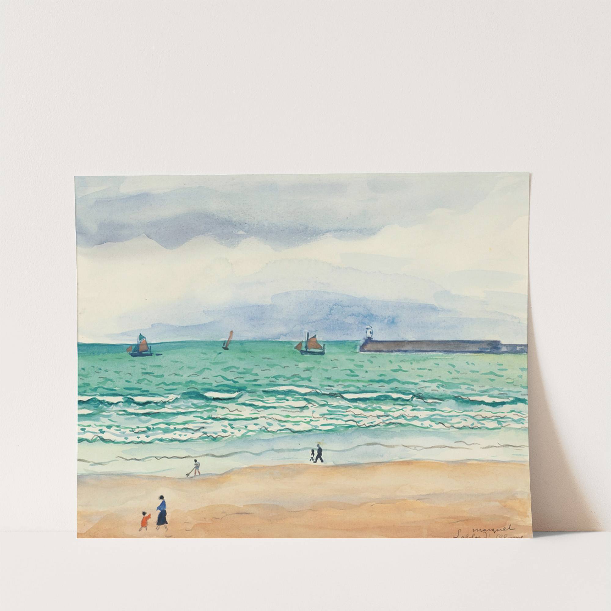 This vibrant watercolor print captures the serene beauty of a coastal scene with "Sables d'Olonne" by Albert Marquet. The painting features a tranquil beach with golden sand stretching across the lower part of the canvas, gently blending into turquoise waves...