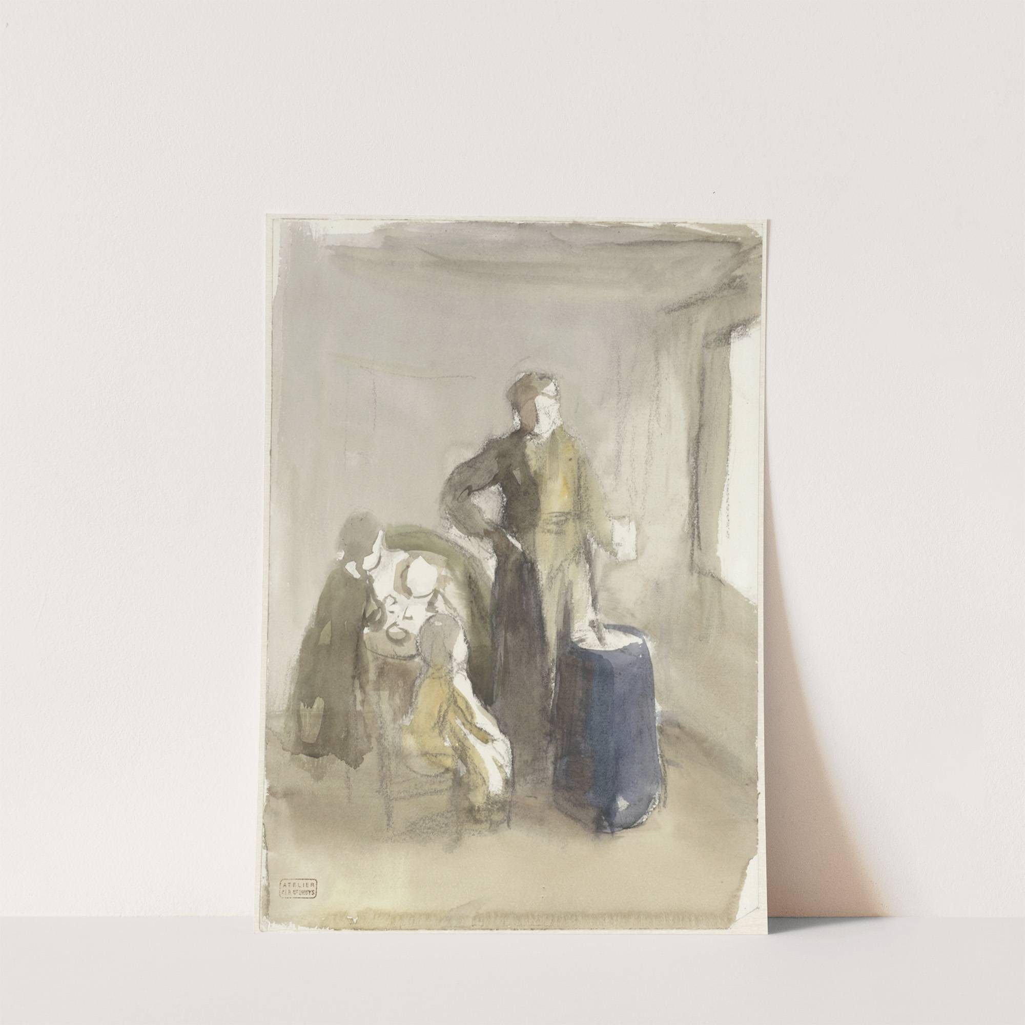 This evocative watercolor painting by Albert Neuhuys captures a tender moment in an understated, softly lit interior space. The composition features a woman standing with a suitcase to her right, while a young child is seated on a chair to...