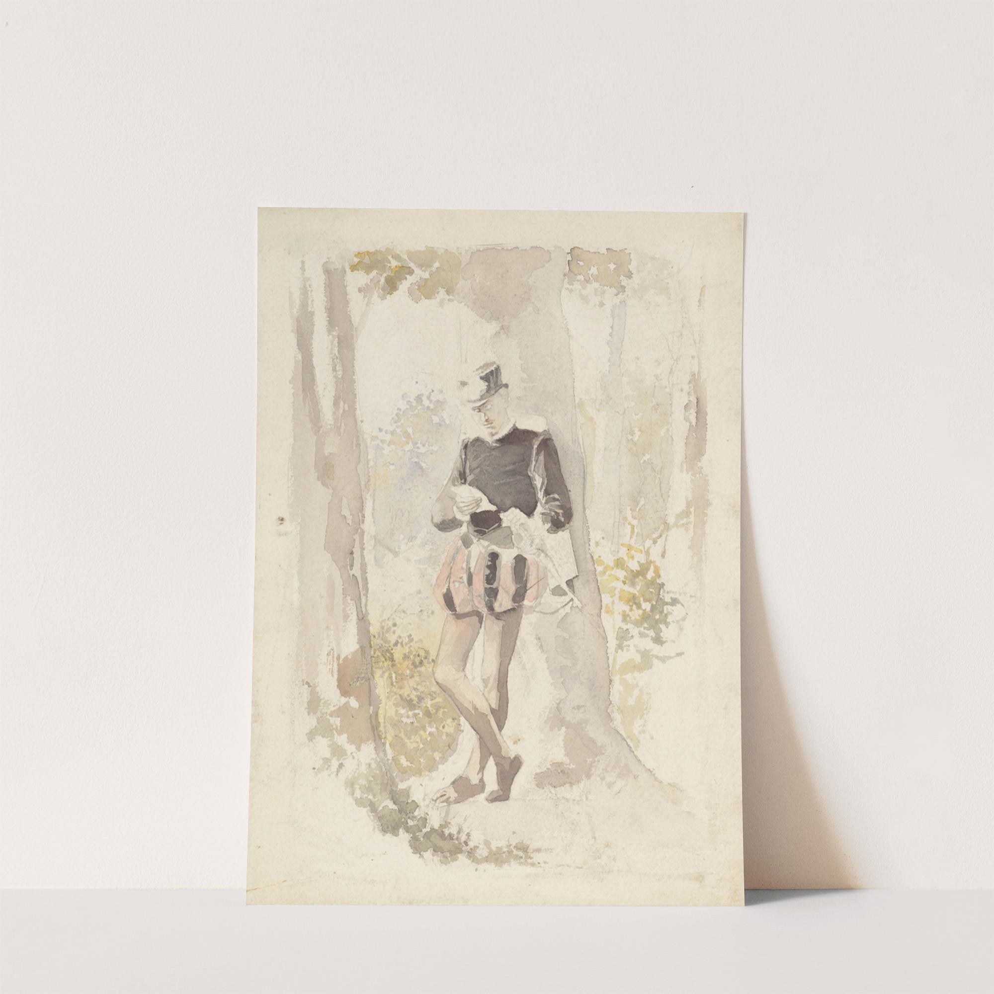 This art print features a delicate watercolor depiction of "Staande Jongeman Die Een Brief Leest" (Standing Young Man Who Reads a Letter) by the artist Albert Neuhuys. The young man, portrayed in soft monochromatic shades of black and white with...