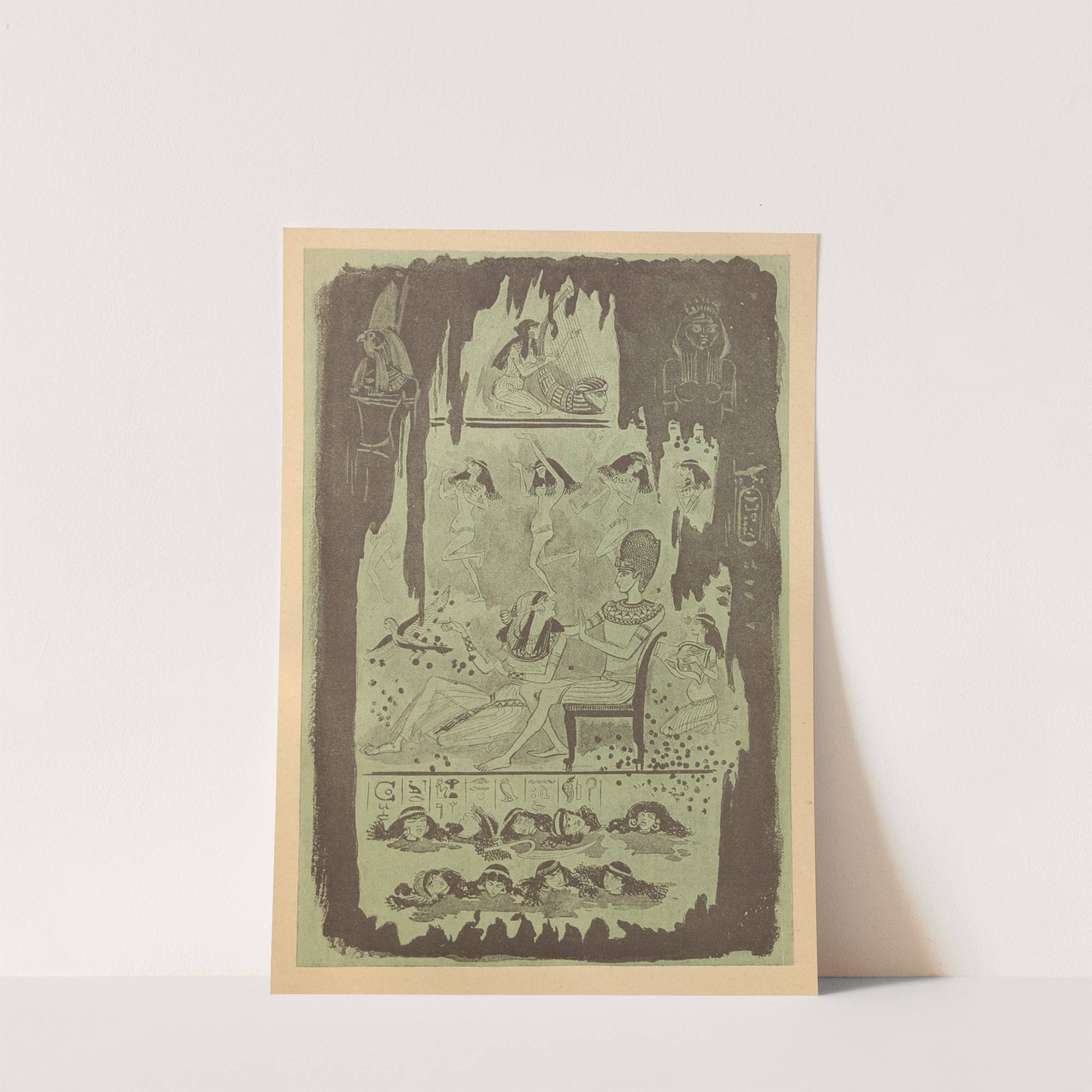 This print, titled "Le Manuscrit de la Momie" by artist Albert Robida from 1895, showcases an intricate and enigmatic scene rendered in monochromatic shades of green and black ink. The central figure is a seated human, depicted with delicate line...