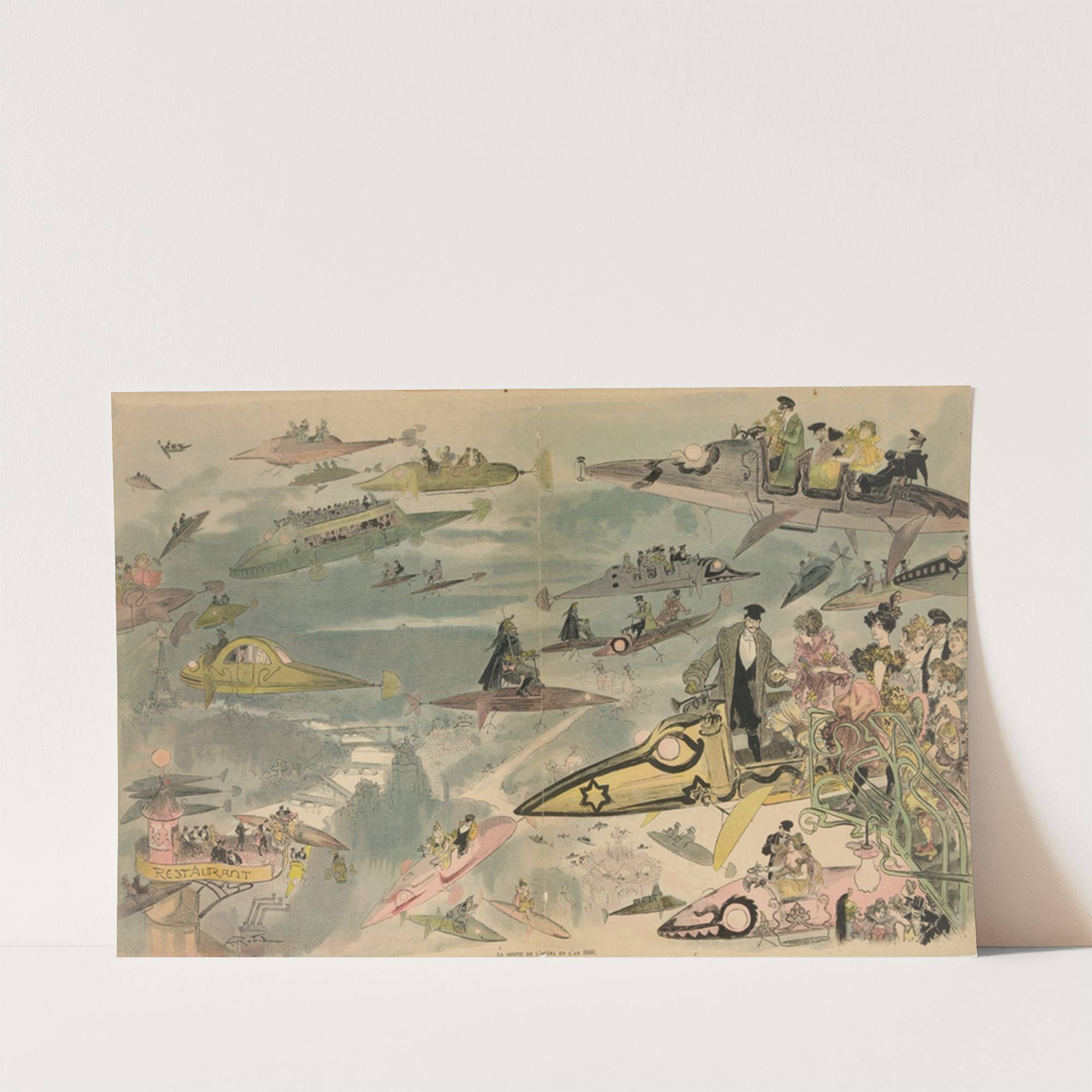 This vibrant artwork titled "Le Sortie de l'op?ra en l'an 2000" by artist Albert Robida is a captivating depiction of a futuristic scene. The image features an array of imaginative, early 20th-century vision of aviatiNumerous aircraft of various designs populate...