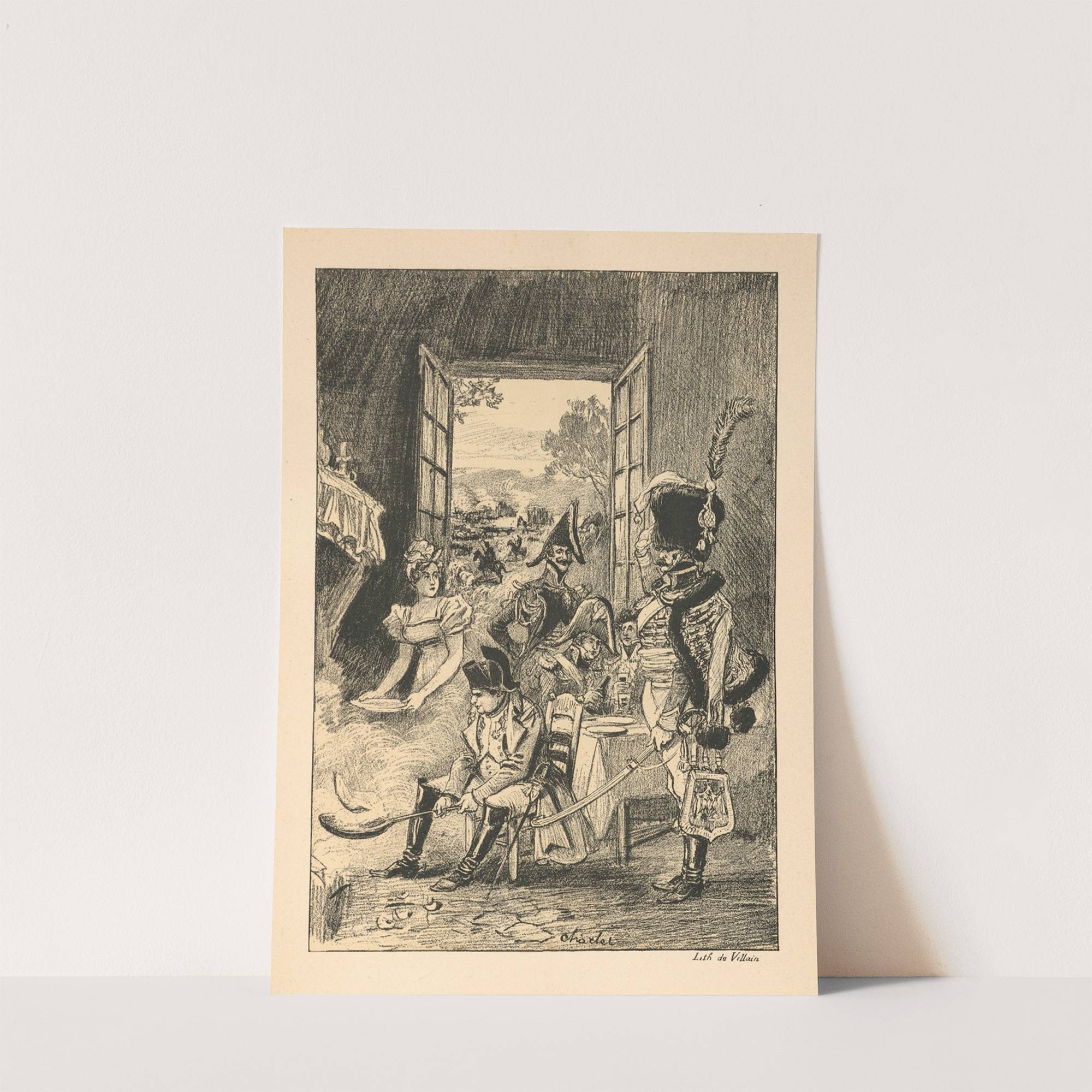 This captivating art print features "Napoléon chez la menuière" by Albert Robida, created in 1895. Rendered in exquisite black-and-white ink, this illustration exudes a timeless, vintage charm. The scene depicts Napoleon Bonaparte standing in an open doorway with an astonished...