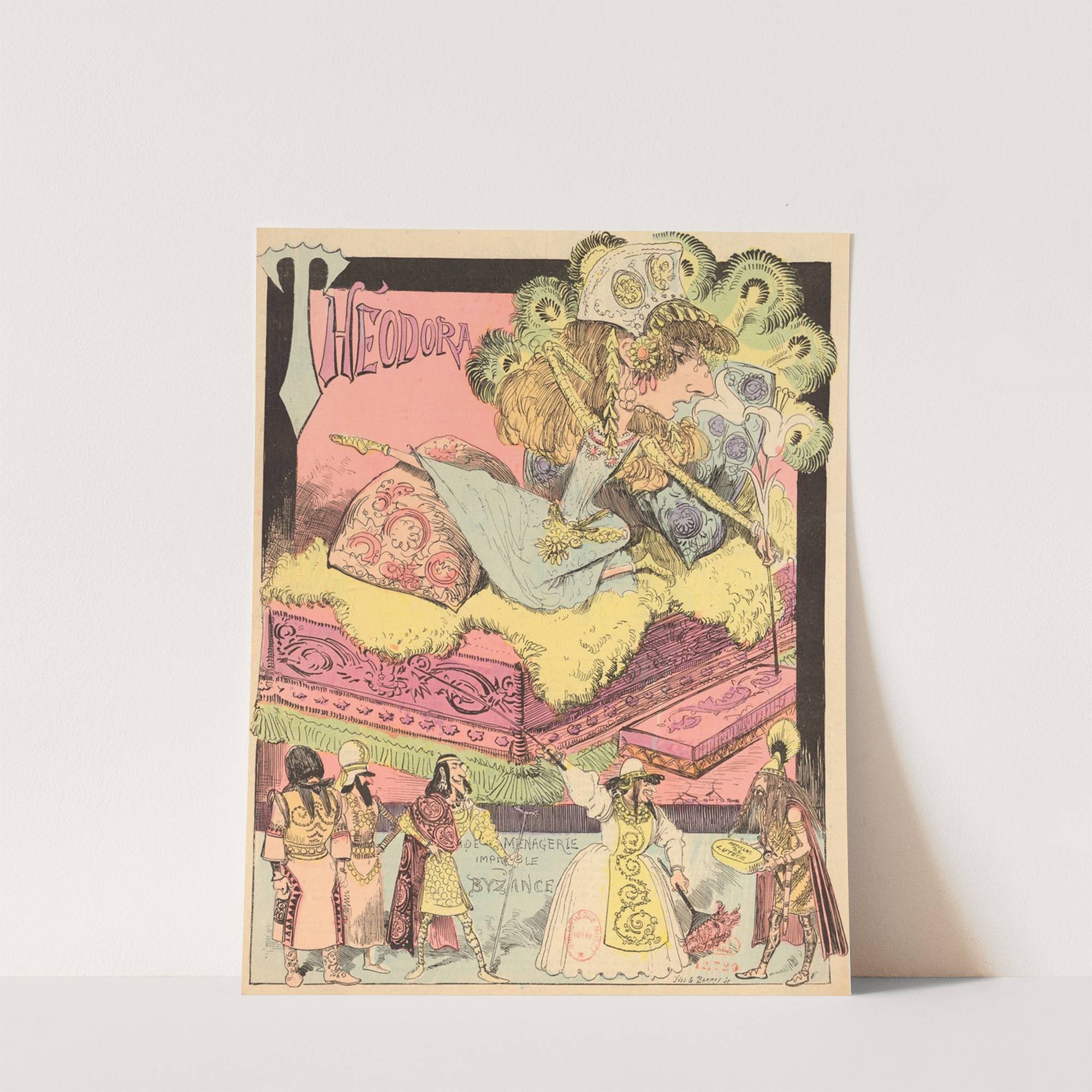 This captivating print features "Théodora – de la ménagerie impériale de Byzance" by Albert Robida, a stunning example of Victorian-era illustration. The artwork depicts an opulent scene with intricate detailing and vibrant colors. Dominating the composition is Théodora herself, reclining...