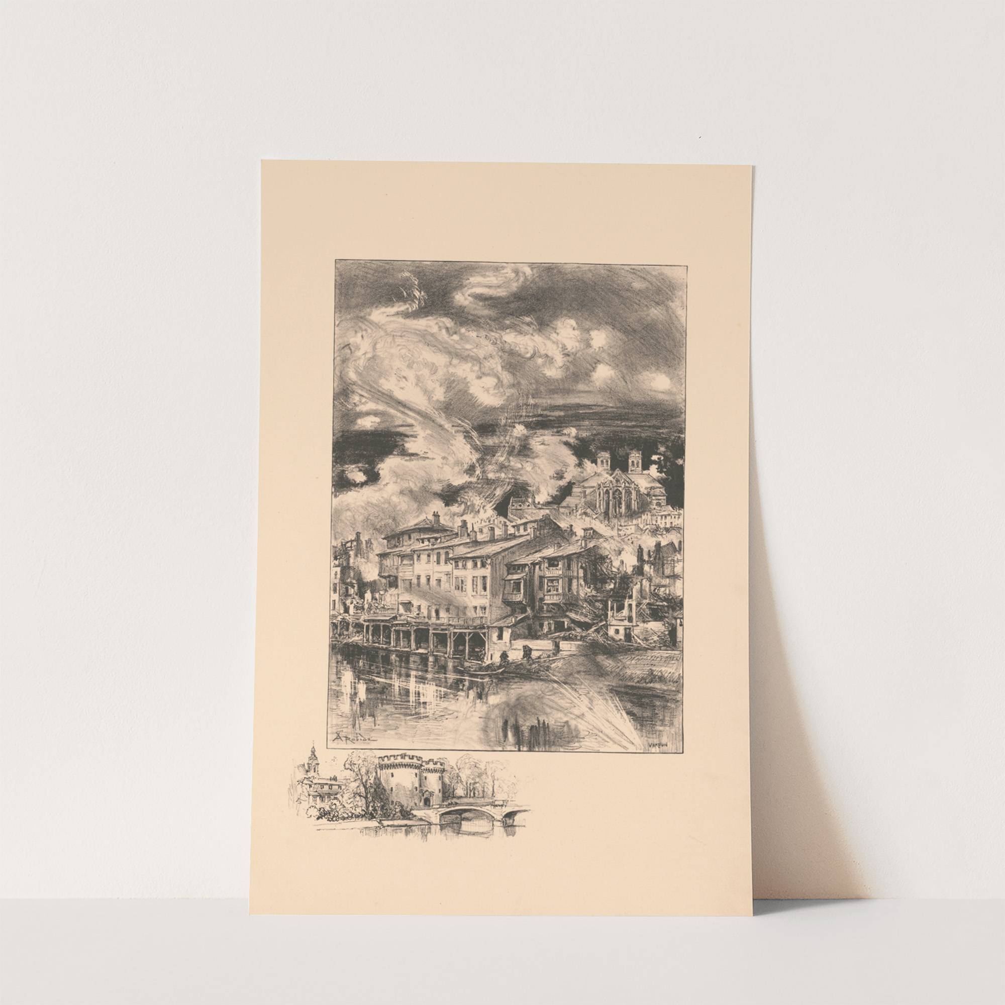 This black-and-white art print titled "Verdun (1916)" by Albert Robida showcases an intricate and dynamic street scene. The image is rendered in fine pencil strokes, with a strong emphasis on architectural details and atmospheric effects. A series of closely packed...