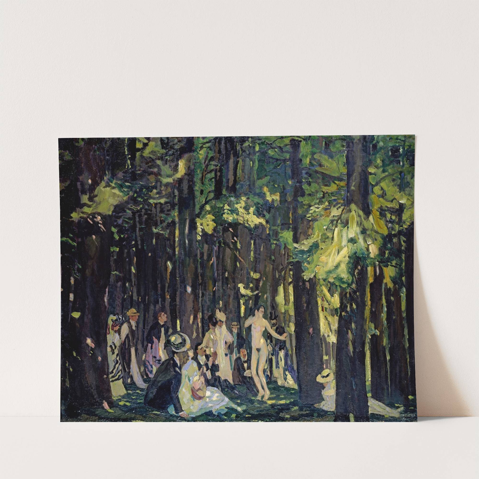 This stunning art print features "Sommertag" by Albert Weisgerber, showcasing an impressionist style with vibrant, expressive brush strokes. The scene depicts a serene forest setting bathed in dappled sunlight filtering through the dense canopy of tall trees. In the foreground,...