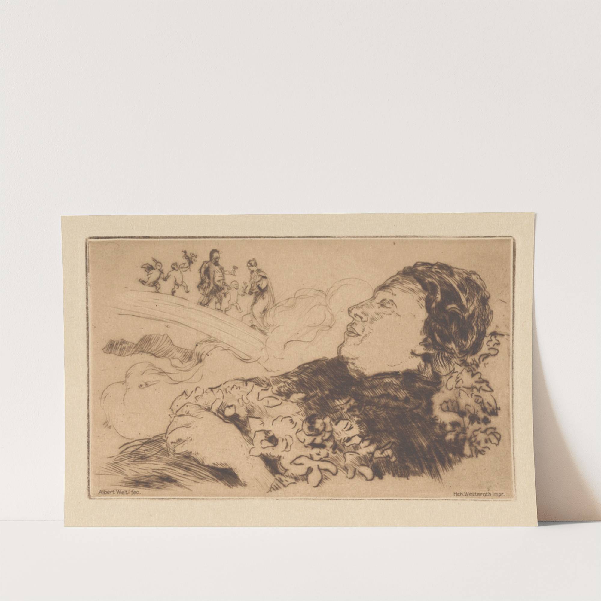 This artwork titled "Erinnerung an die verstorbenen Gemahlin" (Rememberance of the Departed Wife) by Albert Welti is a beautifully rendered monochromatic etching. The piece features a profile view of a woman's face, her dark hair adorned with delicate, blooming flowers...