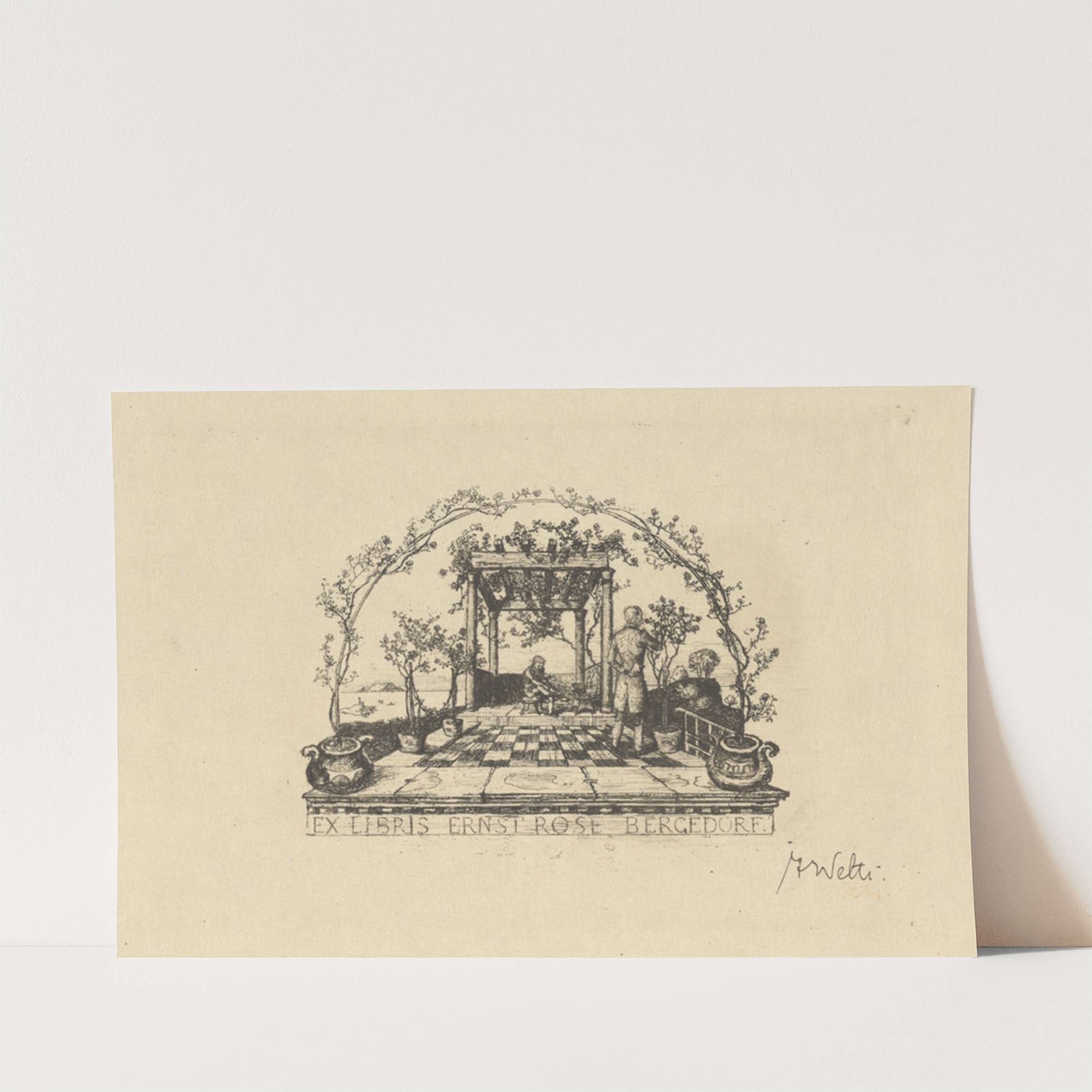 This elegant art print features "Ex Libris Ernst Rose Bergedorf" by the renowned artist Albert Welti. The piece is rendered in meticulous black ink on white paper, showcasing a classical architectural setting with an antique charm. At the center of...