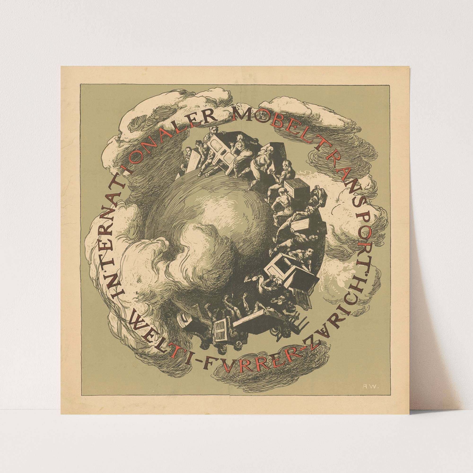 This striking print features "Internationalen M?beltransport. Welti-Furrer Z?rich (1900)" by Albert Welti, showcasing a classic early 20th-century style. The artwork is rendered in sepia tones with intricate black line work and shading, creating a vintage feel. Central to the composition...