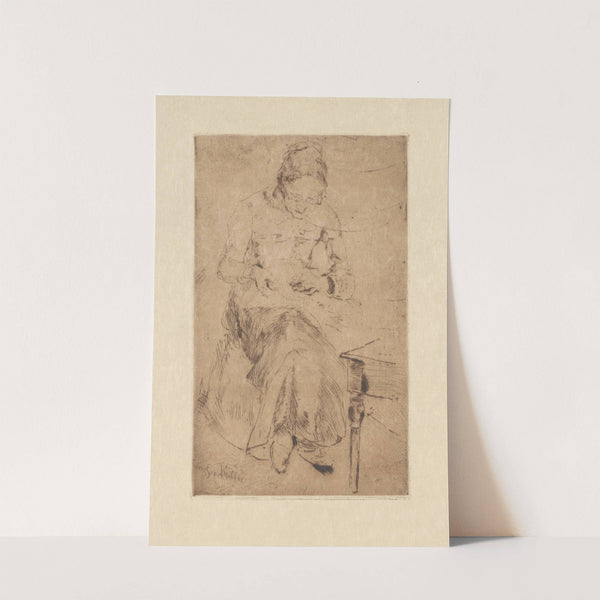 This is "Jungfer Keller" by Albert Welti, a beautifully rendered monochromatic drawing in sepia tones. The artwork features a young woman seated, slightly hunched over as she engages with an object held in her hands, which could be a book...