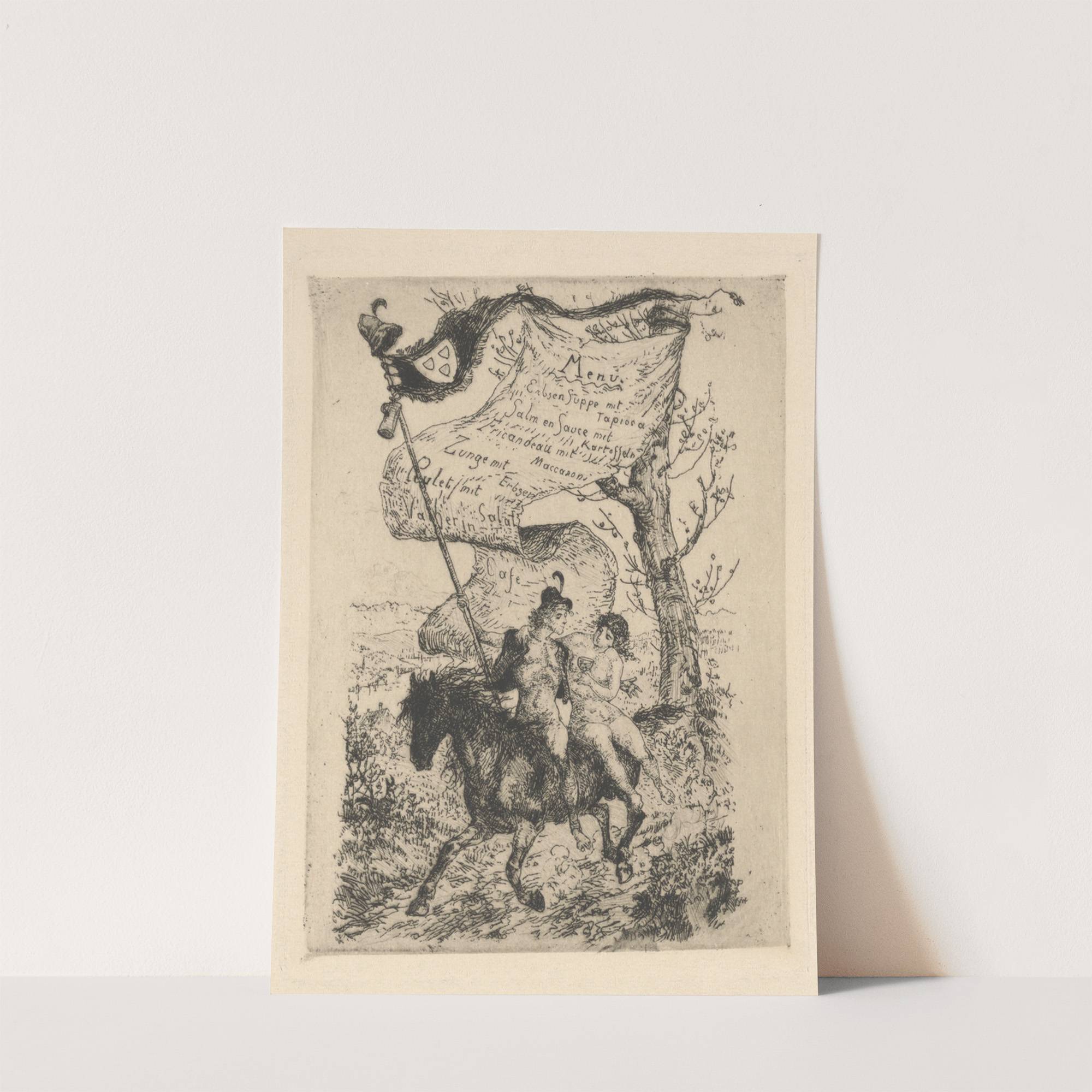 This black-and-white etching by Albert Welti titled "Menu Künstleressen" features a dynamic scene with intricate detail and expressive line work. At the center, two figures ride on horseback through a lightly wooded area; one holds a large banner that billows...