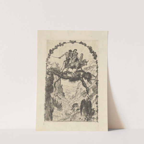 This is "Neujahrskarte Teufelsbrücke" (1902) by Albert Welti, an intricately detailed black-and-white etching that exudes a timeless charm. The composition features two riders atop horses crossing a narrow, arched bridge suspended precariously over a chasm. The archway is adorned with...