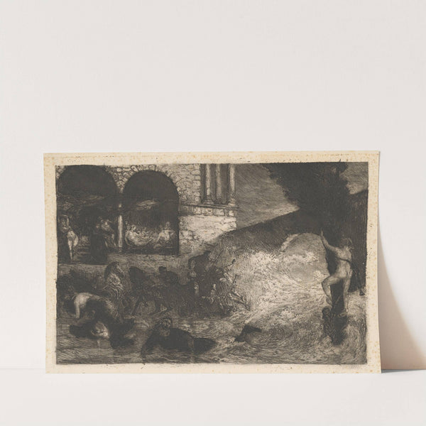 This black-and-white etching features a dramatic, historical scene from "Sündflut Anfang" by artist Albert Welti. The composition is rich with texture and contrast, capturing the somber mood of the piece. In the foreground, a muscular, partially nude male figure stands...