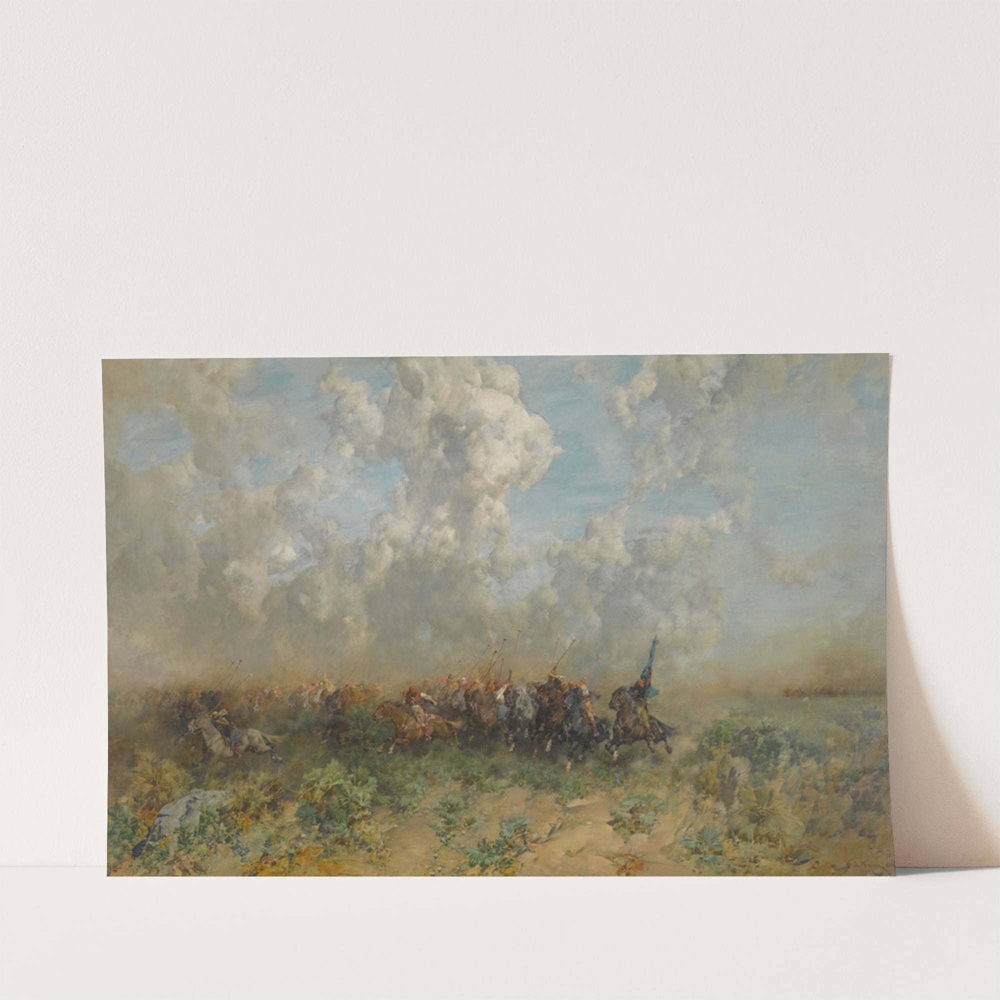 This captivating art print features "The Rout" by the renowned artist Alberto Pasini. This landscape painting captures an intense moment from what appears to be a historical or battlefield scene. Dominating the lower portion of the canvas, a chaotic group...