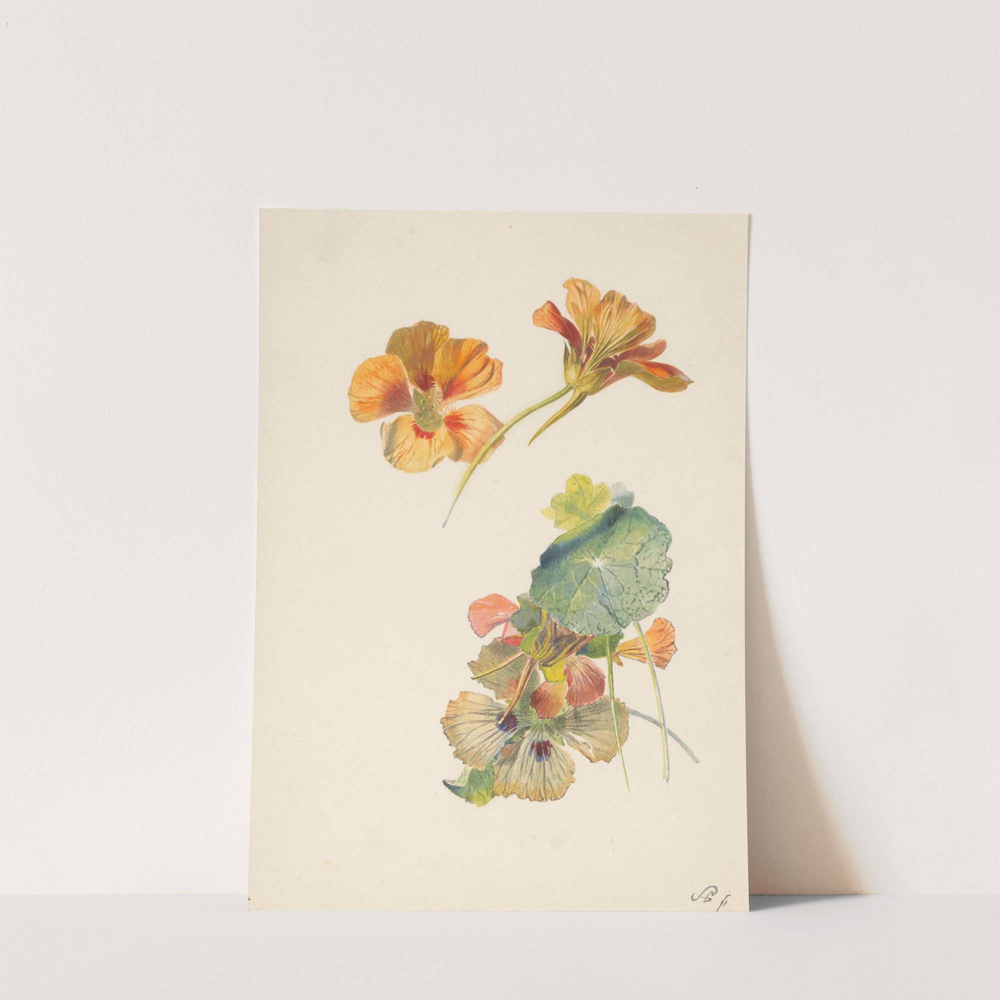 This stunning watercolor illustration features vibrant orange and red flowers with delicate, translucent petals that radiate warmth and beauty. Two larger blossoms are prominently displayed at the bottom right, showcasing intricate veining and subtle gradients of color that add depth...