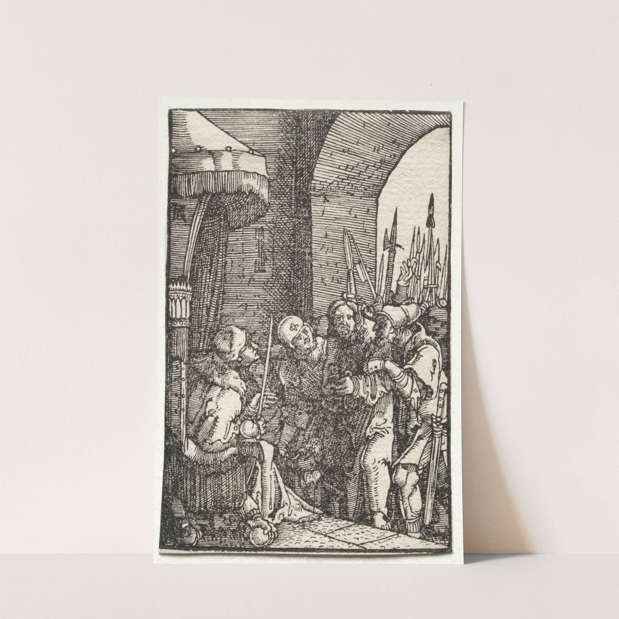 This black-and-white illustration depicts "Christ Before Pilate" by Albrecht Altdorfer, showcasing a powerful historical religious scene rendered in meticulous detail. The central figure of Jesus is shown with a somber expression, standing before a seated Pontius Pilate who raises his...