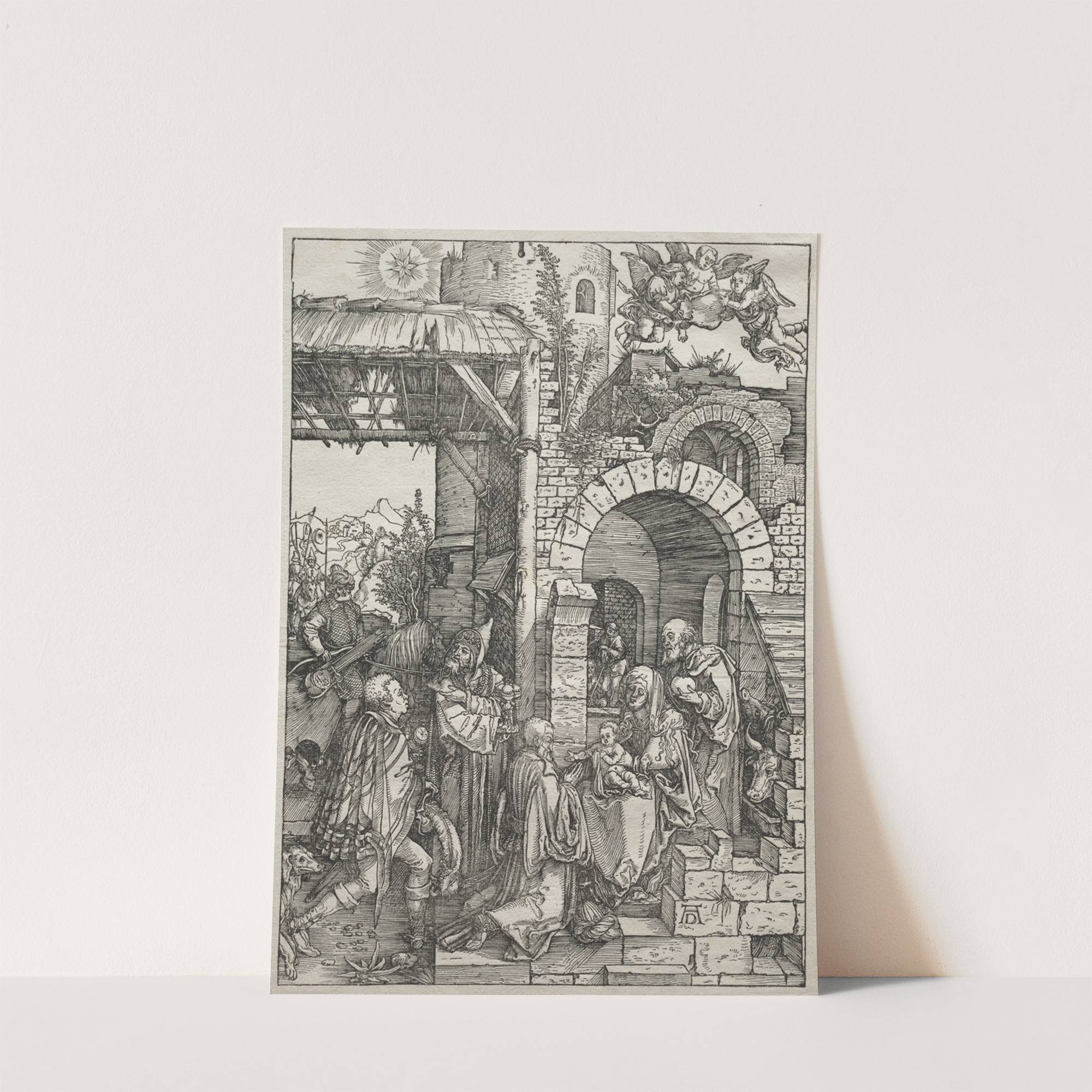 This intricate black-and-white artwork, "Adoration of the Magi" by Albrecht Dürer, depicts a biblical scene with remarkable detail and precision. The composition showcases a nativity setting within a rustic stone structure that features an arched doorway and a partially visible...