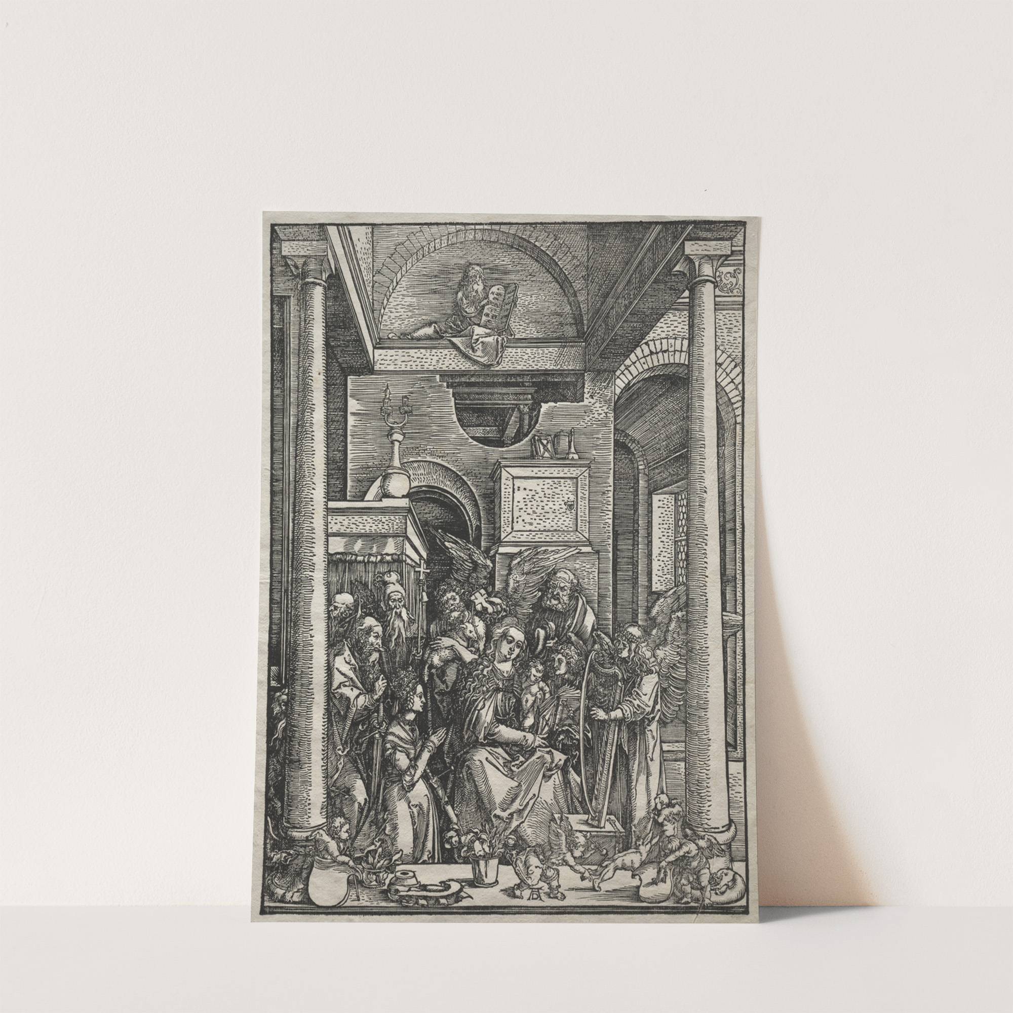 This exquisite black-and-white engraving depicts "Adoration of the Virgin and Child" by Albrecht Dürer, created circa 1504-1505. The detailed artwork showcases a crowded scene within an intricately designed architectural setting. Majestic columns with ornate capitals support the arches of the...