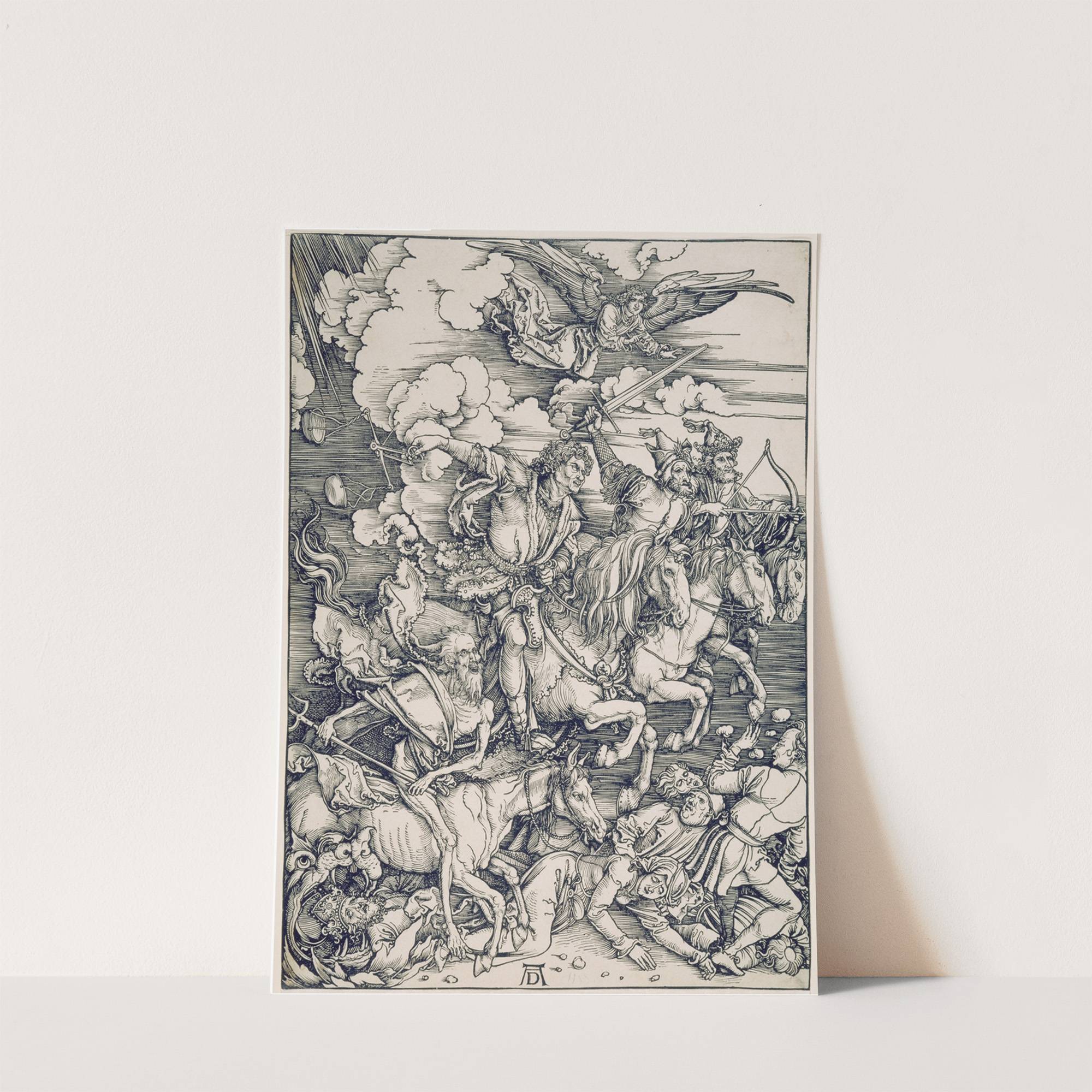 This art print features "Die apokalyptischen Reiter," a masterpiece by Albrecht D?rer, known for his intricate and expressive black-and-white illustrations. The scene is bursting with dramatic intensity as armored riders on rearing horses clash amidst a chaotic cloud of smoke...