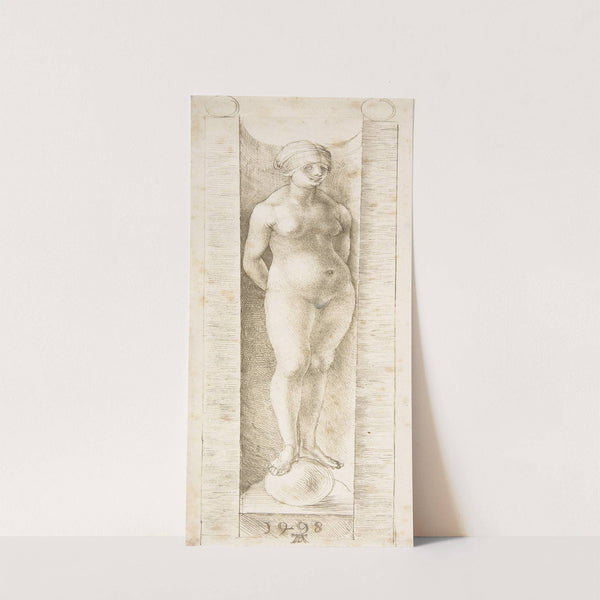 This elegant black and white art print is a meticulous reproduction of "Fortuna in a Niche" by Albrecht Dürer, created in the year 1498. The piece features a detailed, realistic portrayal of a full-bodied female figure standing nude within a...