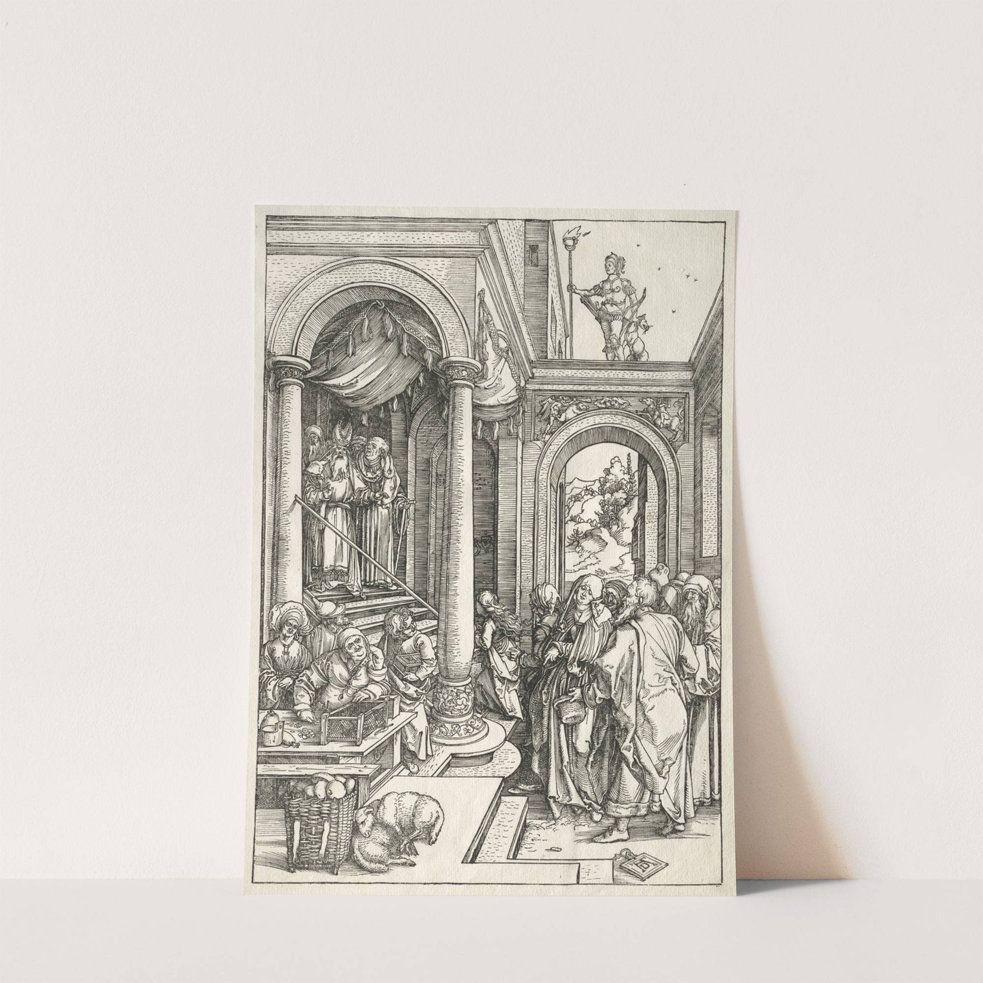 This black-and-white illustration presents a detailed depiction of "Presentation of the Young Virgin in the Temple" by Albrecht Dürer. The scene is set within an ornate temple, characterized by grand architectural elements such as towering columns and intricately carved archways....