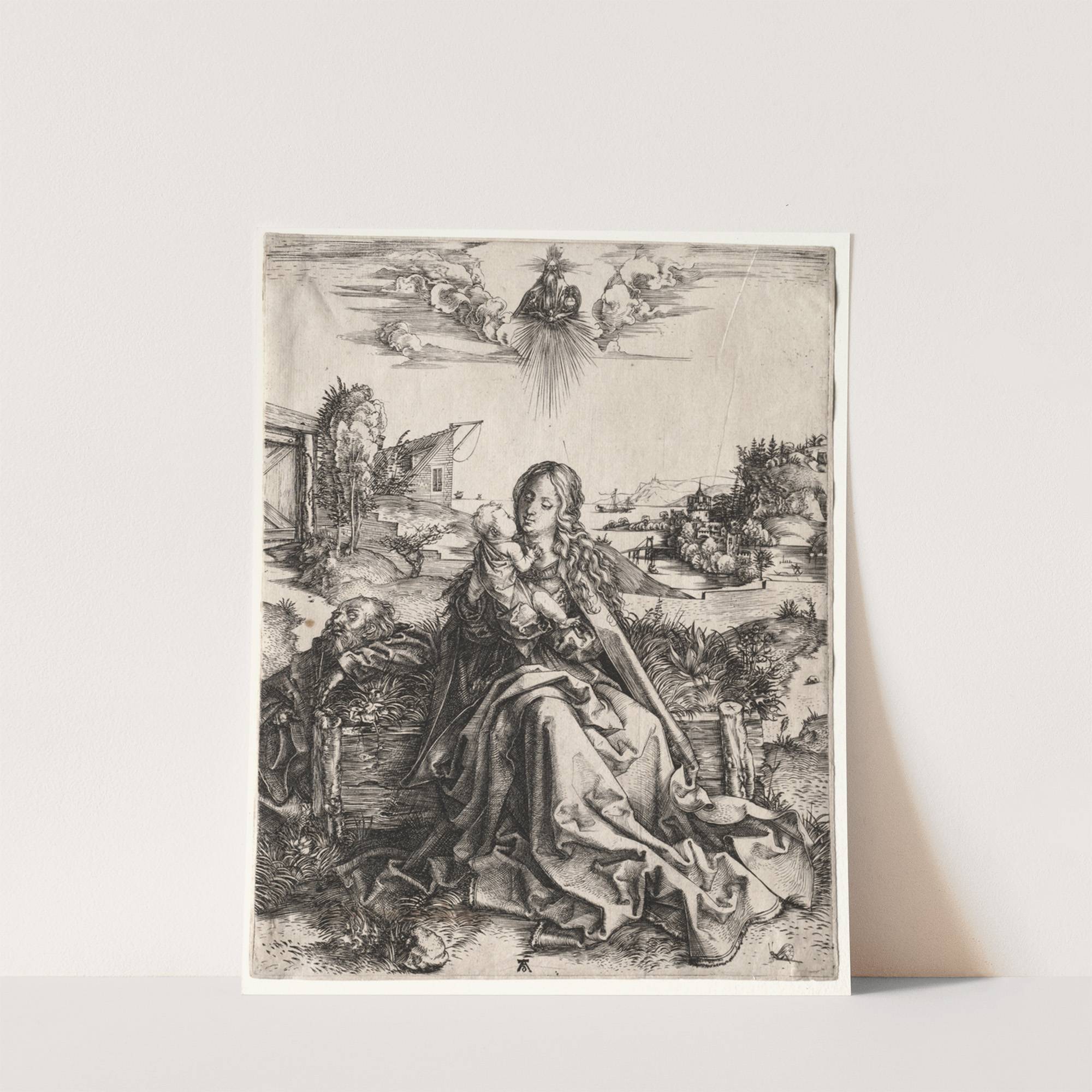 Experience the timeless beauty of "The Holy Family with the Butterfly" by Albrecht Dürer. This striking black-and-white woodcut print captures a serene, yet evocative scene. At its center, Mary sits gracefully in a flowing gown that cascades down her lap,...
