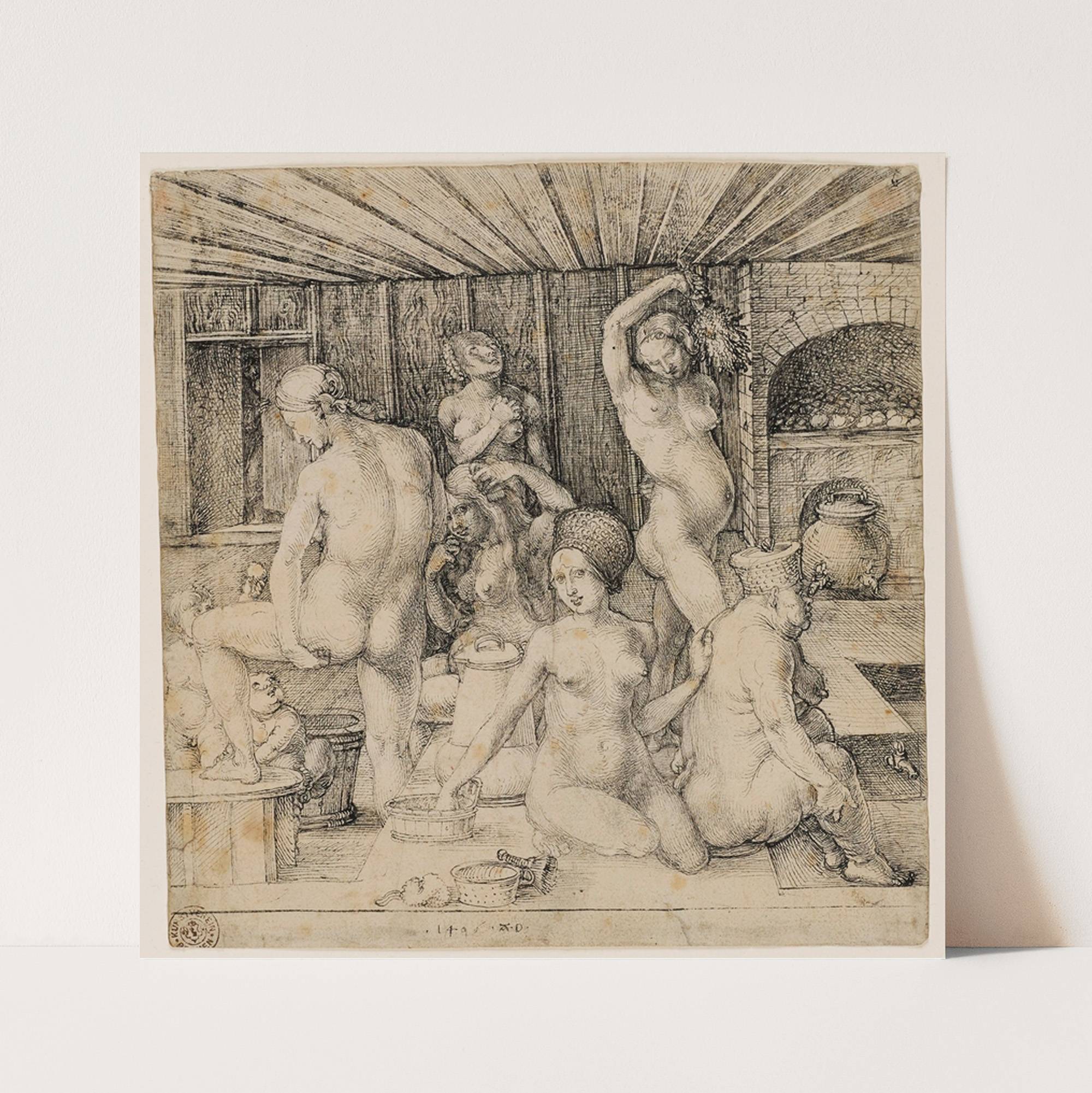 This exquisite print depicts "The Women's Bath," a classic work by renowned artist Albrecht Dürer. Rendered in meticulous black and white line art with detailed cross-hatching, it captures the timeless elegance of Renaissance artistry. The scene features eight nude women...