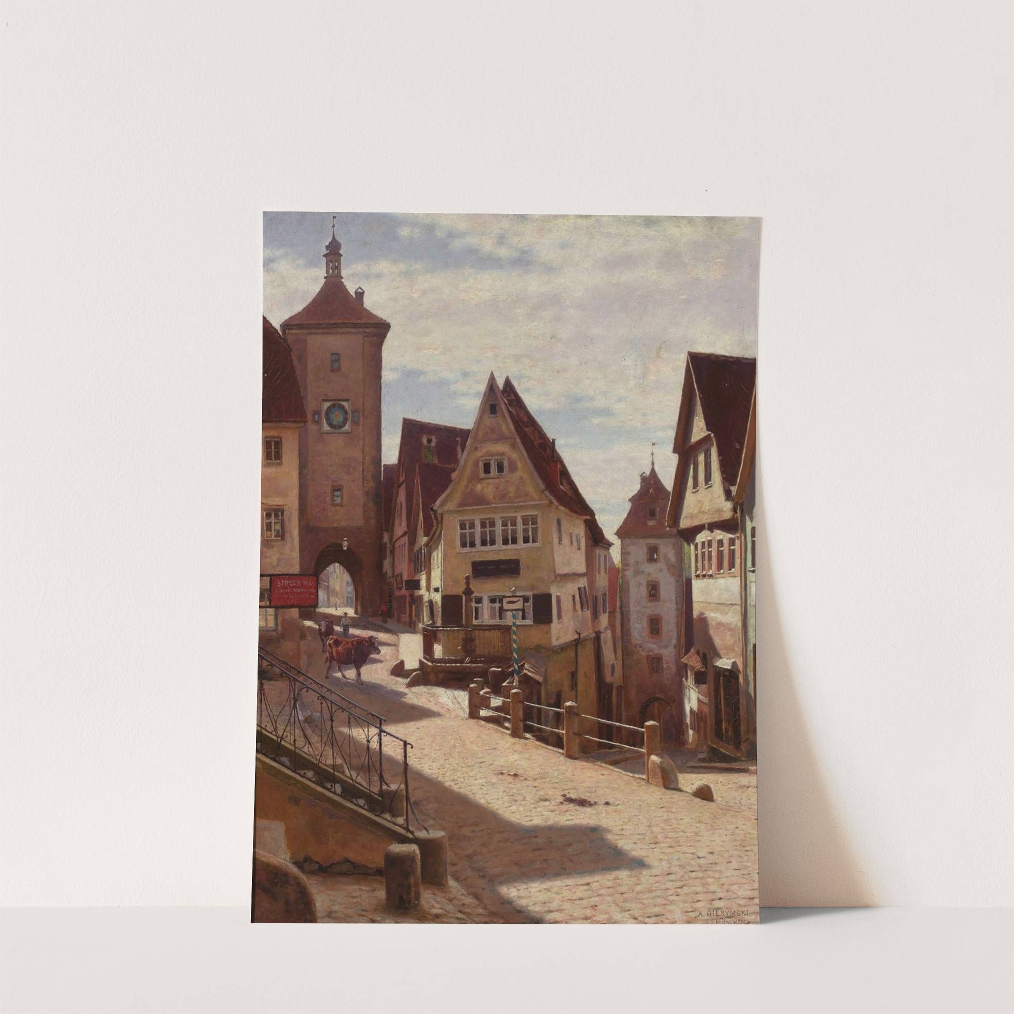This enchanting art print captures "Am Plönlein in Rothenburg" by Aleksander Gierymski, showcasing a quaint, historical European street scene bathed in soft, golden sunlight. The image depicts a cobblestone street lined with charming half-timbered buildings featuring steep roofs and intricate...
