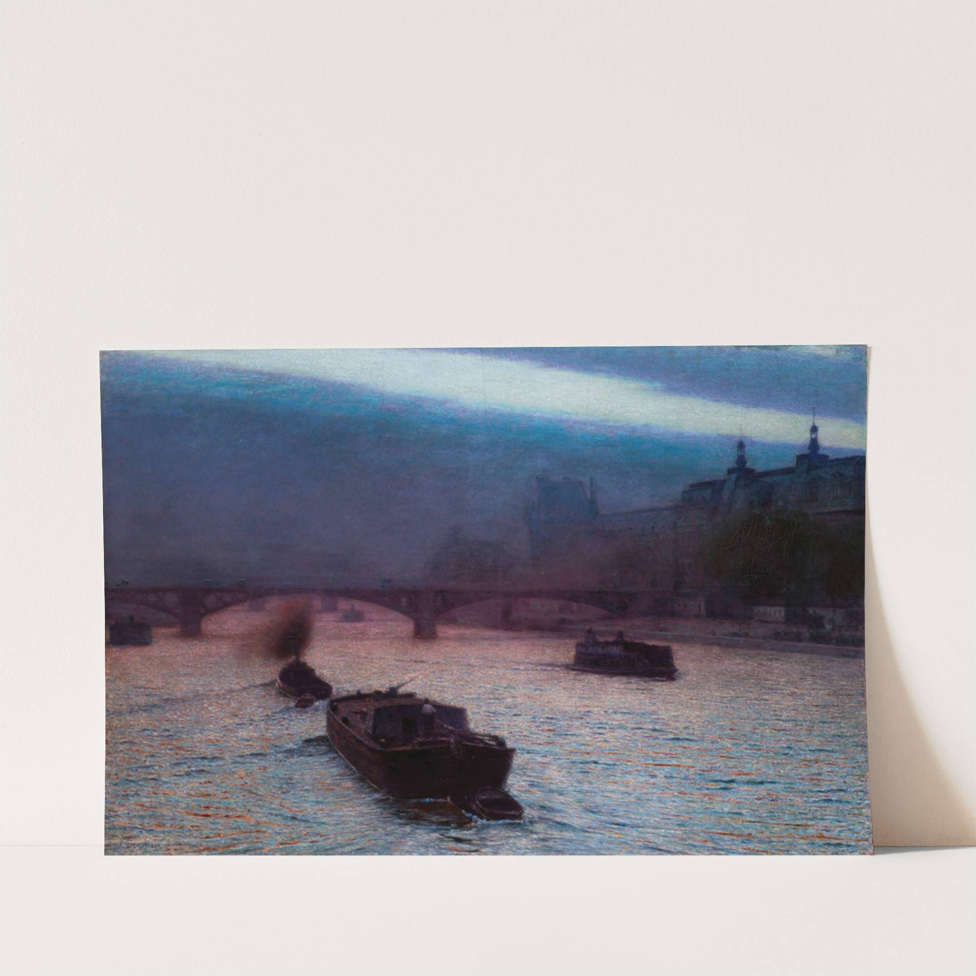 Experience the serene yet haunting beauty of "Evening on the Seine" by Aleksander Gierymski. This evocative art print captures a twilight river scene with an ethereal, almost photographic realism. The water in the forIn the midground, three darkened boats drift...