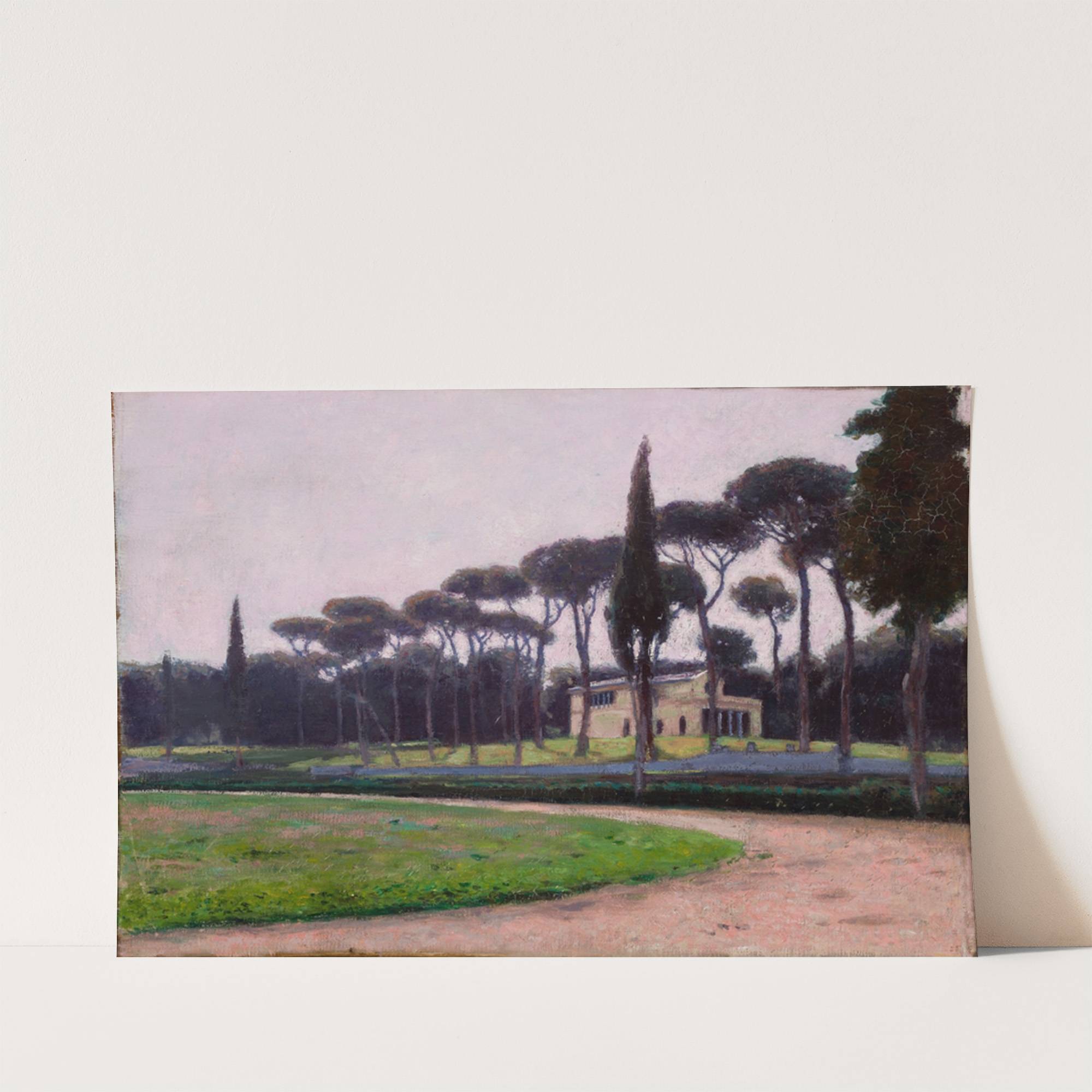 This artwork captures "Villa Borghese in Rome" by Aleksander Gierymski, depicting an elegant and serene garden scene from the early 20th century. The painting features a small yellow villa set amidst a lush, verdant lThe foreground showcases a gently curving...