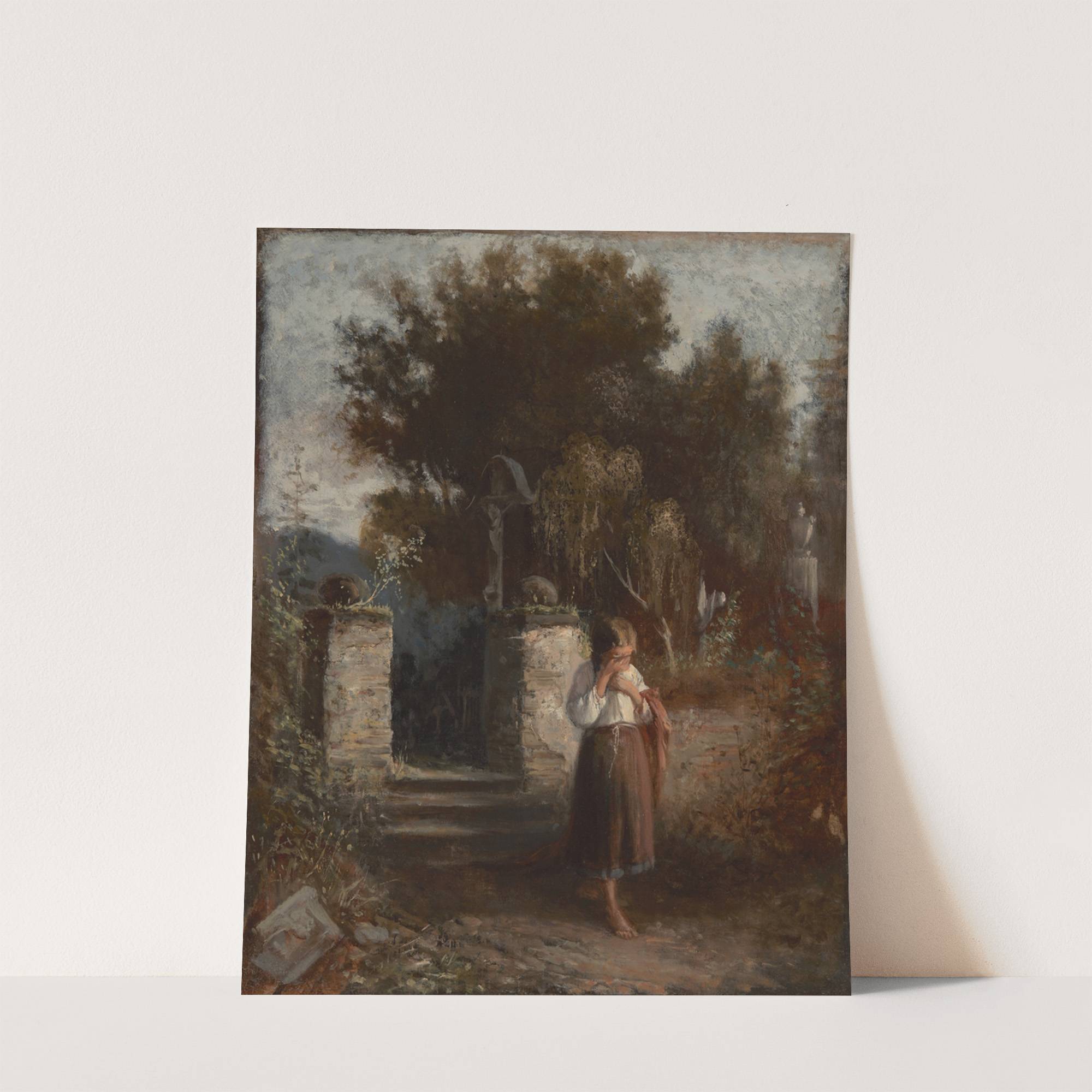 This stunning painting, "Orphan" by Aleksander Kotsis, captures a poignant moment in a rustic, rural landscape. At the center of the composition stands a young girl with fair skin and dark brown hair tied back with a ribbon. She is...