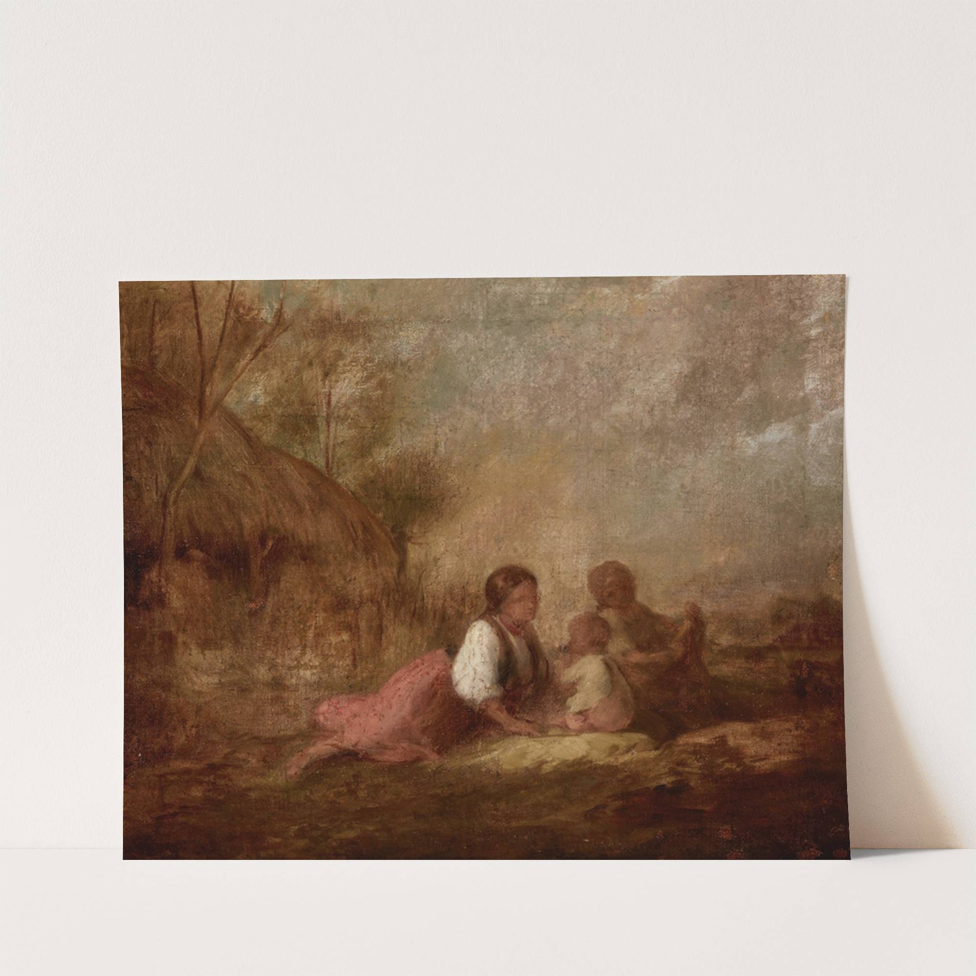 This beautiful art print showcases "Pastoral Scene" by Aleksander Kotsis, a richly textured piece that evokes a sense of timeless tranquility. The painting depicts a serene rural setting with soft, earthy tones dominating the palette. In the foreground, a woman...