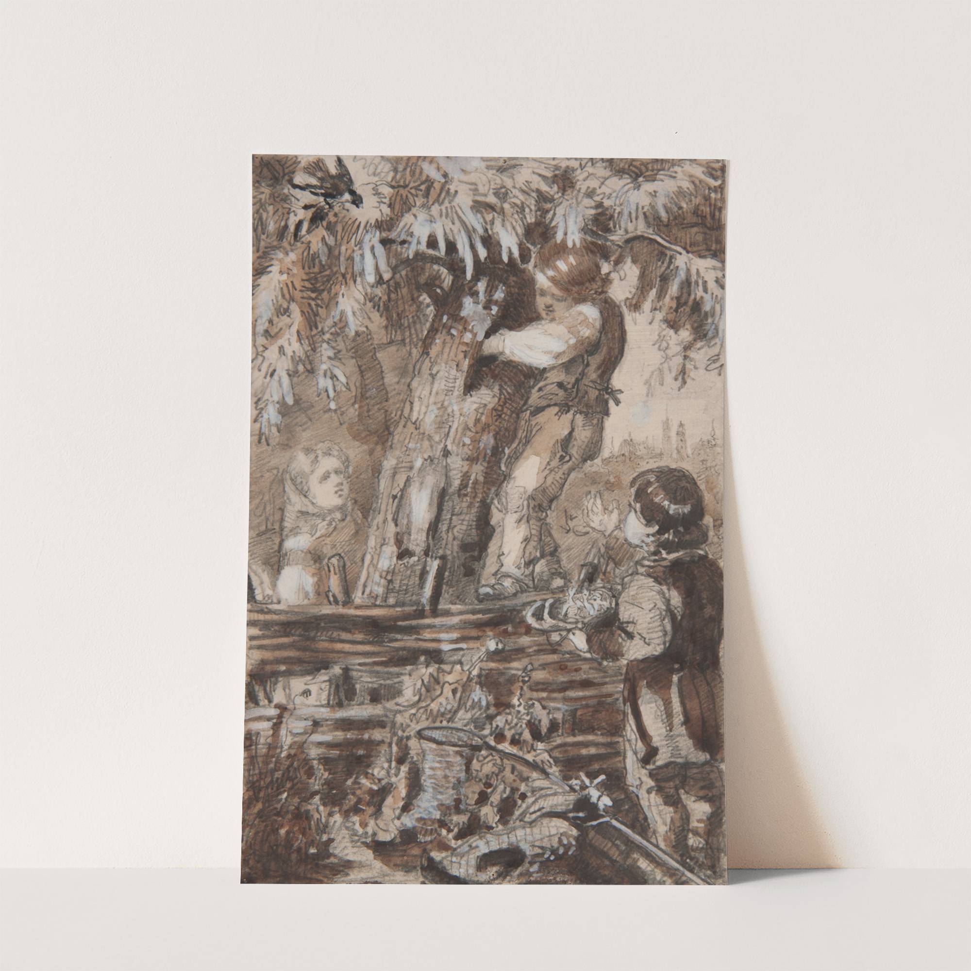 This monochromatic art print titled "Poszukiwacze gniazd" by Aleksander Kotsis captures a nostalgic, nature-filled scene with intricate detail and timeless charm. The composition features three children exploring their surroundings beneath the expansive branches of a tall tree. The artist uses...