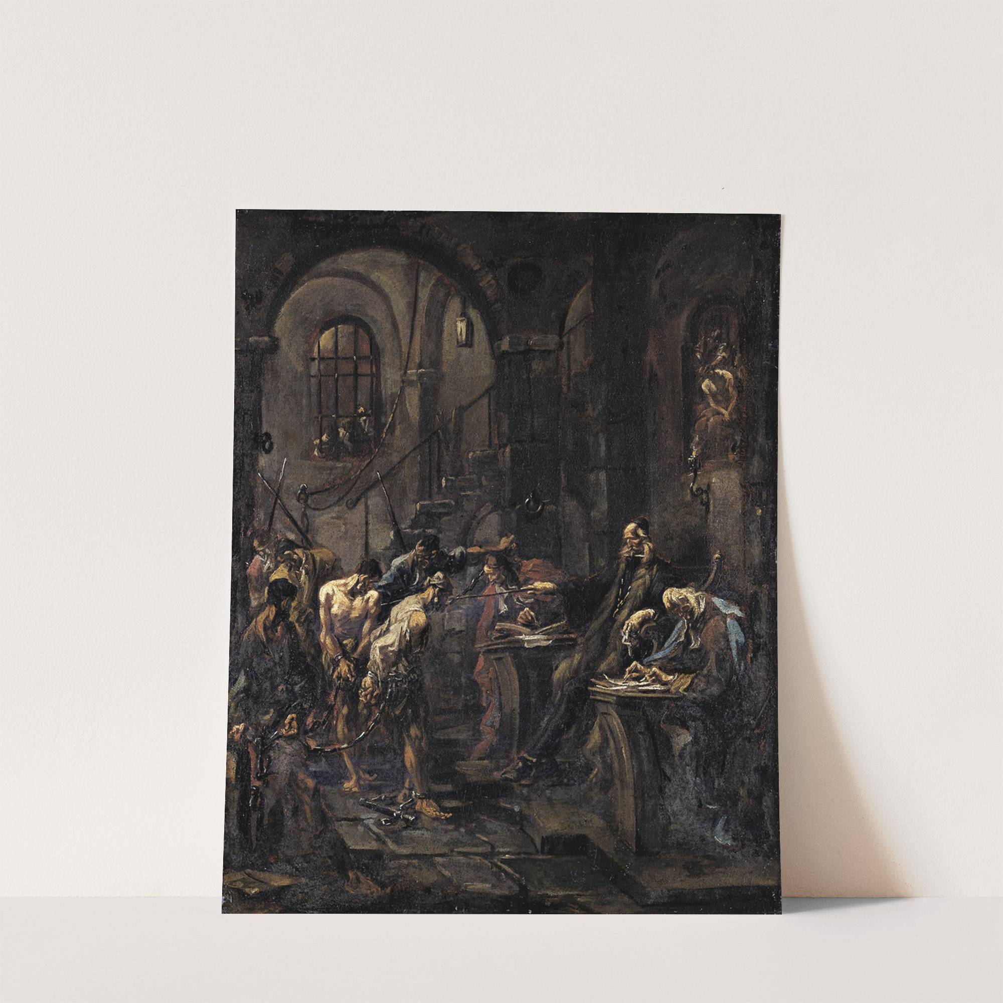 This dramatic painting, "Brutal Interrogation" by Alessandro Magnasco, showcases a dark, intense scene set in a dimly lit, ancient stone building. The composition features multiple figures engaged in an eerie and tumultuous moment. On the left, several soldiers with grim...