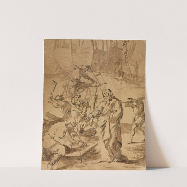 This sepia-toned drawing by Alessandro Magnasco depicts a dynamic scene from the biblical story of Noah's Ark. The artist employs a delicate yet expressive monochromatic style, capturing movement and interaction among the figures. In the foreground, two men engage in...