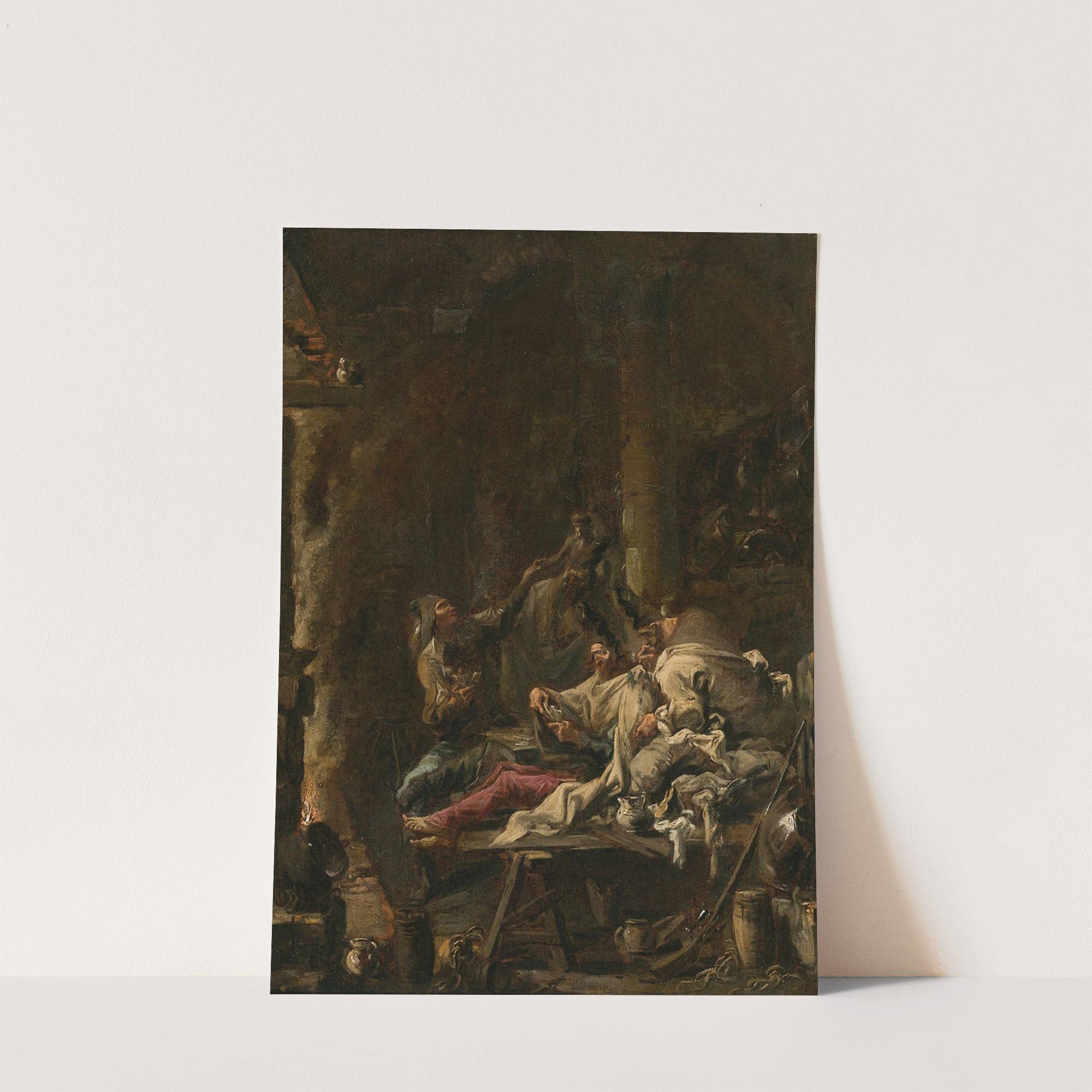 This striking oil painting by Alessandro Magnasco titled "Cardplayers by a Fire" captures a deeply atmospheric scene with masterful use of shadow and light. The composition features a dimly lit, rustic interior where four men are engaged in card playing...