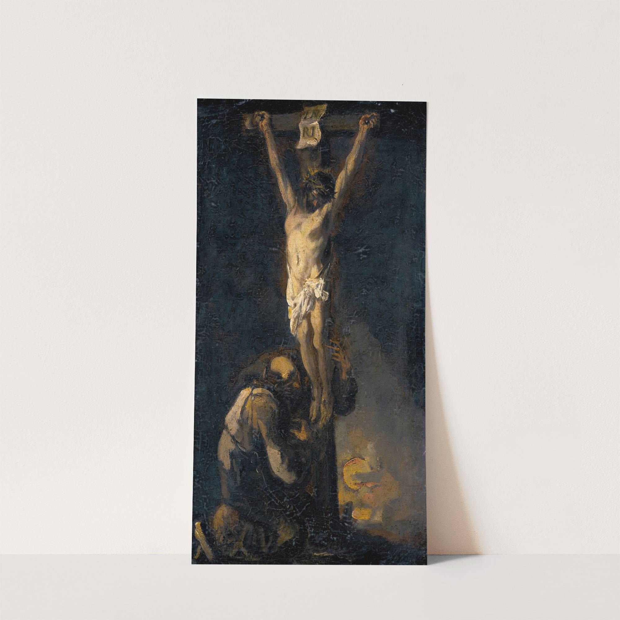 This striking art print features "The Crucifixion" by Alessandro Magnasco, a masterpiece of Baroque realism. The composition centers on a vivid depiction of Jesus Christ crucified on the cross, his body illuminated against the dark, shadowy background. His muscular frame...