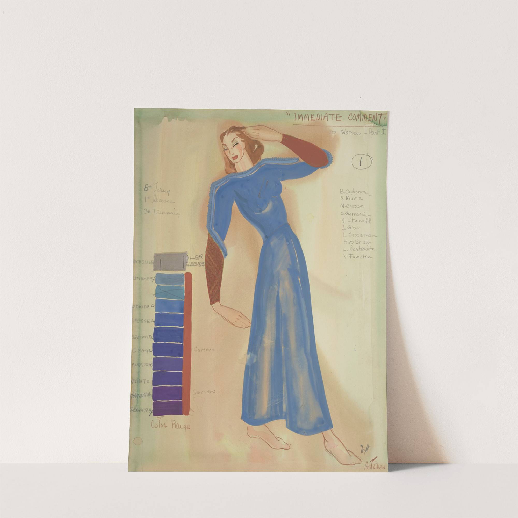 This vibrant art print features "Immediate Comment," a watercolor illustration by the artist Alex Jones. The central figure is a woman with light brown hair, styled in loose waves and adorned with simple, delicate earrings. She wears a striking blue...