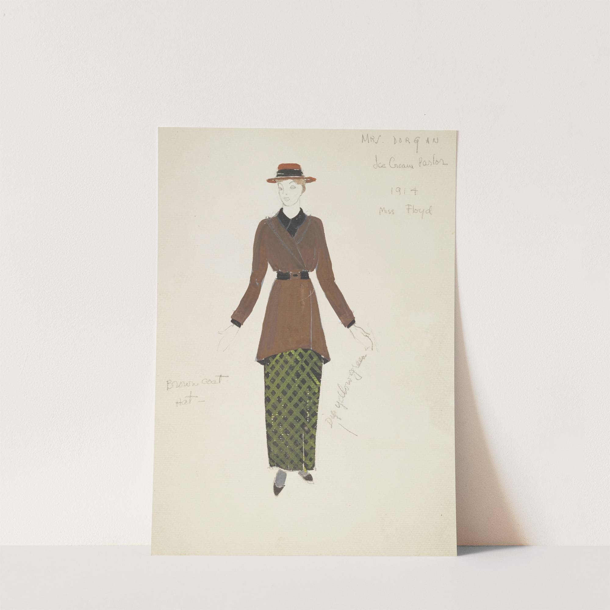 This elegant illustration depicts "Miss Floyd" in "Life and Death of an American," created by artist Alex Jones. The subject is portrayed standing against a plain white background, with subtle hand-written notes providing additional context. She wears a stylish brown...
