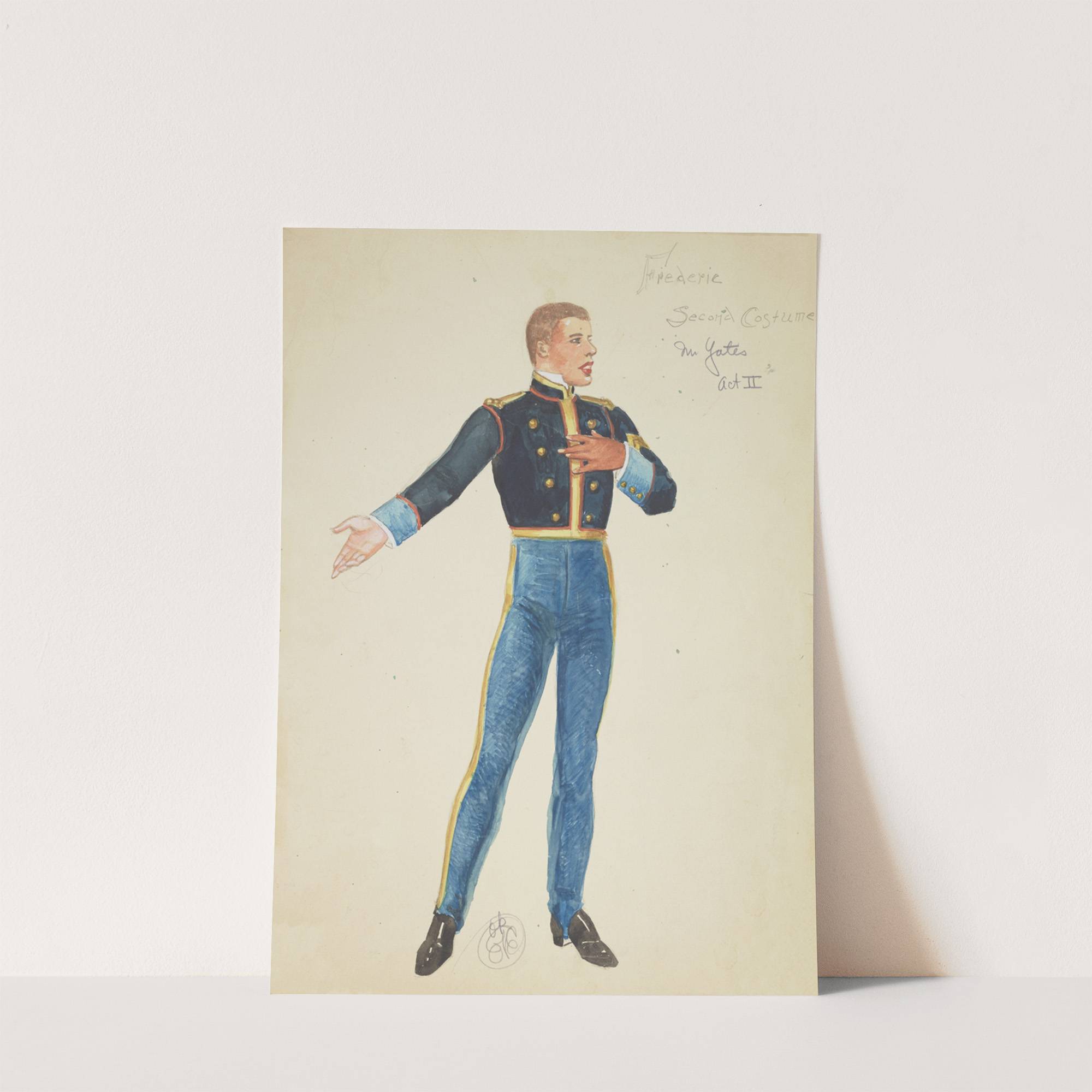This art print features "Frederic Second Costume" from the opera 'The Pirates of Penzance' as illustrated by artist Alex Jones. The illustration is done in a traditional watercolor style with clear, vivid colors and fine details. Frederic stands confidently, wearing...